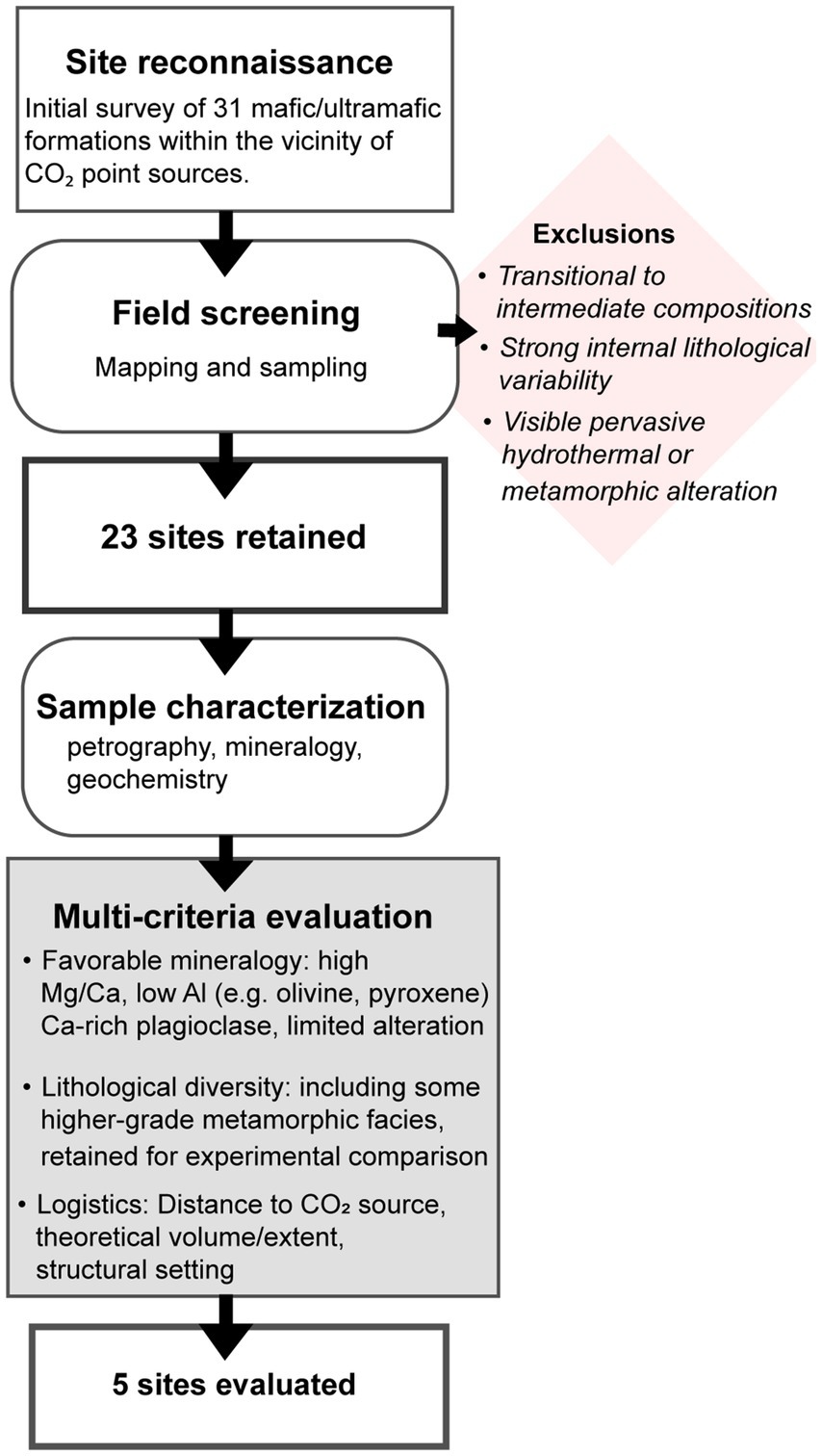 In each fieldwork area, rock formations that in theory would be suitable for CO2 mineralization (mafic to ultramafic rocks) were sampled. In total, 31 localities were visited for reconnaissance mapping and screening, and samples were taken from 23 of these sites for subsequent analysis. The complete workflow for site evaluation and selection is summarized in Figure 2. Whole-rock geochemical analyses were conducted at both MSALABS and ALS due to time constraints. Comparable analytical methods were employed at both laboratories, including Aqua Regia and four-acid digestions for trace element analysis, and lithium borate fusion for whole-rock and REE determinations. The main procedural difference was that major element oxides were quantified by ICP-ES at MSALABS, whereas XRF was used for these determinations at ALS to facilitate comparison with standard datasets. Quality assurance and control measures included the analysis of replicates and laboratory standards alongside the samples.