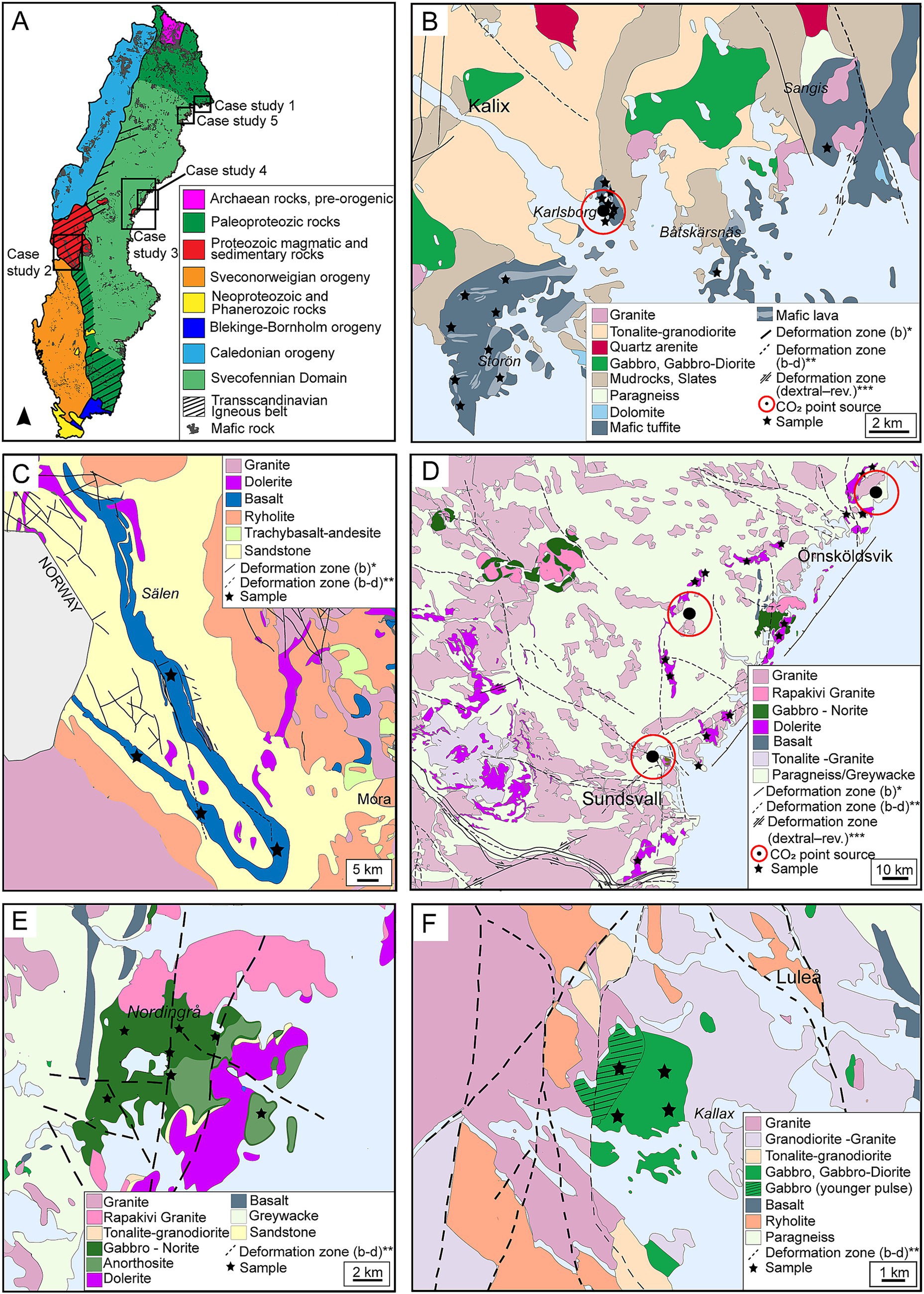 Figure 3. Overview and geological context of the five selected case study areas in Sweden, based on data from SGU (Geological Survey of Sweden) (2013), Åhman and Wikström (1990) and Lundqvist (1987). (a) Map of Sweden showing the major lithotectonic units and the locations of the five case study areas. (b) Geological map of the Kalix area (case study 1). (c) Geological map of west-central Sweden, showing the Öje basalt formation (case study 2). (d) Geological map of east-central Sweden covering the Örnsköldsvik–Sundsvall area and the dolerite belt (case study 3). (e) Geological map of the Nordingrå area showing gabbro anorthosite formations (case study 4). (f) Geological map of the Luleå area and the Kallax gabbro (case study 5). *b = brittle, **b-d = brittle-ductile, ***dextral-reverse.
