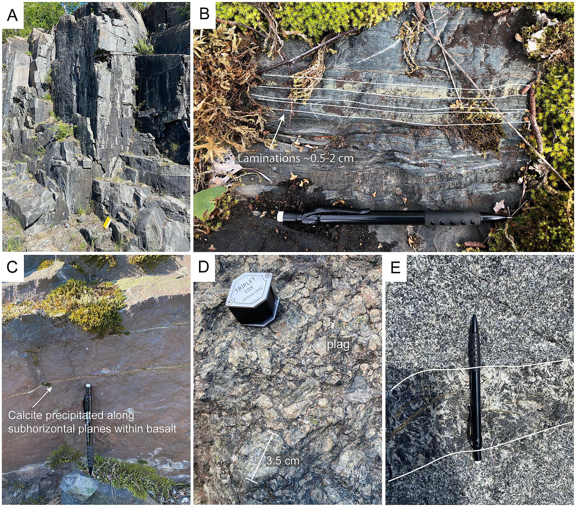 Figure 4. Field images. (a) bedrock exposure in the Nordingrå gabbro complex. (b) tuffite in Kalix showing clear compositional lamination. (c) internal layering divided by thin carbonate veins in one of the samples sites in Öje. (d) plagioclase crystals from an anorthite exposure in Nordingrå. (e) insulated coarser grained dolerite dyke within a dolerite close to Örnsköldsvik.