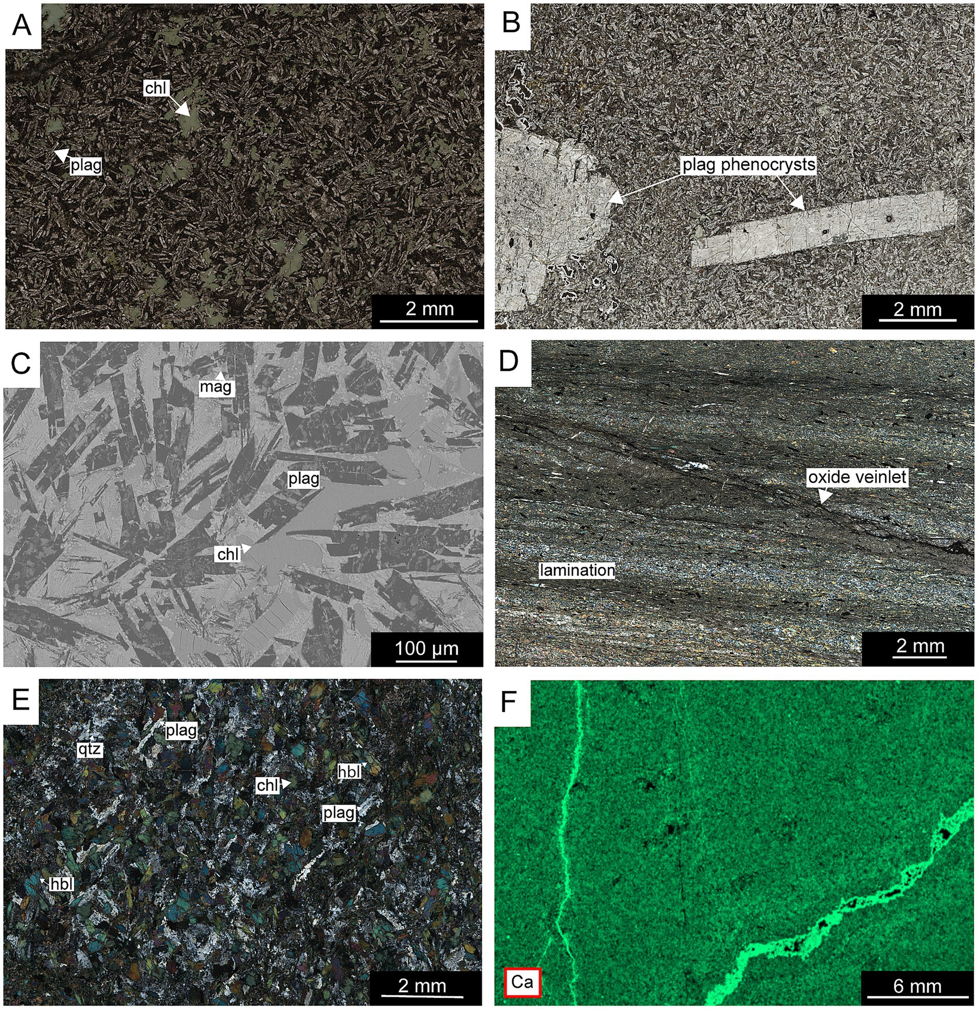 Figure 5. Photomicrographs (plane-polarized light, cross-polarized light), μXRF scan and backscattered electron (BSE) image of metavolcanic rocks from Öje and Kalix. (a) Overview of albite-rich Öje metabasalt. (b) Plagioclase phenocrysts (>2 mm) in a fine-grained basaltic matrix in the Öje basalt. (c) BSE image showing randomly oriented plagioclase laths with altered mafic phases infilling interstitial spaces in the Öje basalt. (d) Laminated tuffite from Kalix. (e) Overview of the minerology of the basaltic unit in Kalix. (f) μXRF scan elemental map showing Ca-distribution in the Öje metavolcanic rock.