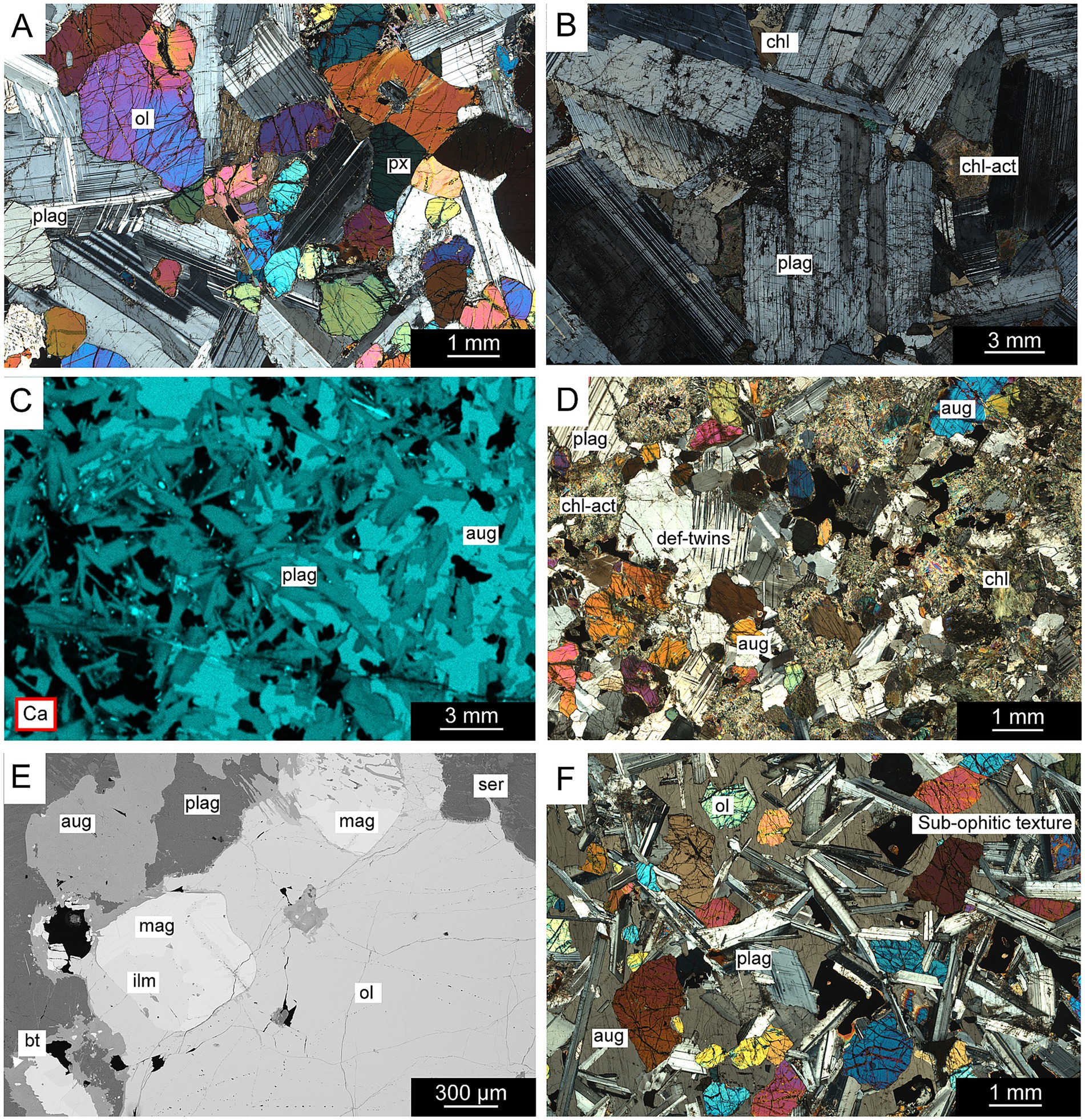 Figure 6. Photomicrographs (plane-polarized light, cross-polarized light), μXRF scan, and backscattered electron (BSE) image of the plutonic rocks in Nordingrå, Örnsköldsvik, Sundsvall and Kalix. (a) Olivine and pyroxene crystals set in a plagioclase-rich matrix in the Nordingrå plutonic rock. (b) Coarse plagioclase grains within anorthosite from Nordingrå. (c) μXRF elemental map showing calcium distribution in a CSDG dolerite sample from Örnsköldsvik. (d) Overview of the mineralogy in the Kallax gabbro. (e) BSE image showing an overview of the mineralogy in a CSDG sample from south of Örnsköldsvik. (f) Subophitic texture in dolerite from the CSDG, south of Sundsvall.