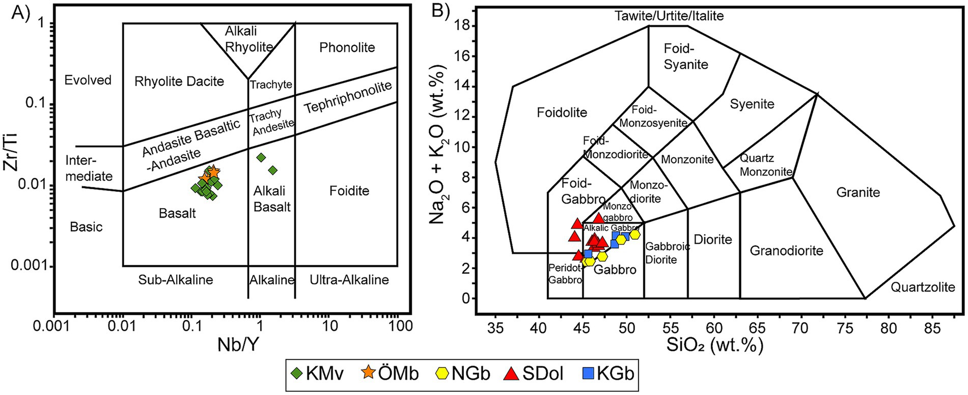 Figure 7. Classification diagrams based on whole rock geochemical data (a) Zr/Ti vs. Nb/Y diagram proposed by Pearce (1996), based on Winchester and Floyd (1977). (b) Classification and nomenclature of the plutonic rocks based on the total alkalis (Na₂O + K₂O) versus SiO₂ (TAS) diagram proposed by Middlemost (1994).