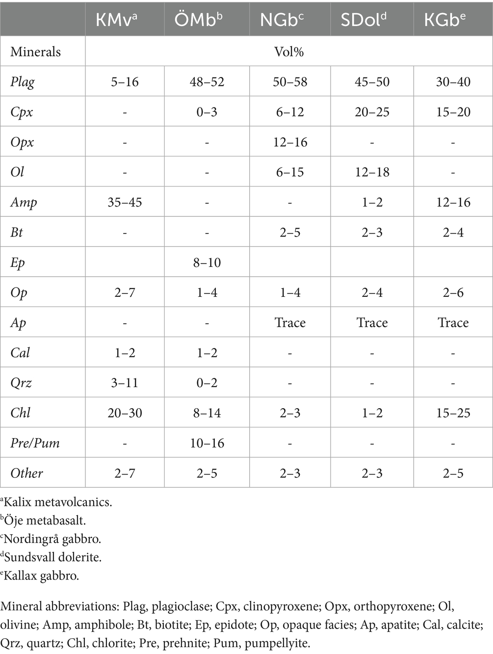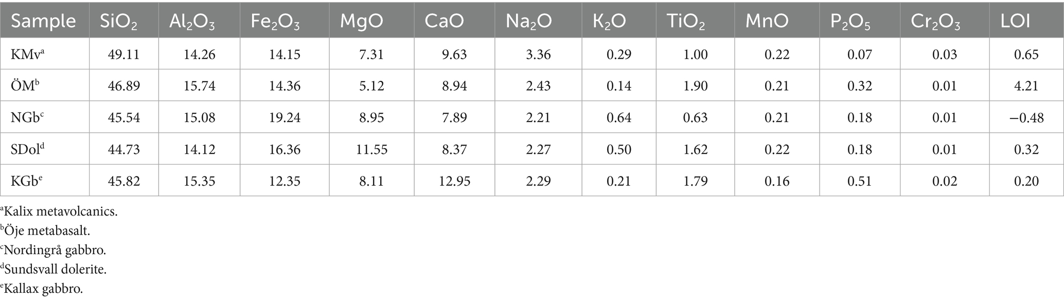 Alteration indices (Chemical Index of Alteration, CIA, and Mafic Index of Alteration, MIA) were calculated for each formation (Babechuk et al., 2014). These data are available in the appendix (Supplementary Table S2). Both the dolerites from Sundsvall and Örnsköldsvik and the Nordingrå gabbro show minor leaching (ΔMIA(R) > 0 with moderate CIA*), whereas the Kallax gabbro – although more altered mineralogically – shows a low/flat MIA(R). This could reflect retention/addition of Mg (±Fe) in secondary phases under oxidizing conditions, which decouples MIA from CIA during alteration. The Öje basalt (prehnite–pumpellyite to lower greenschist) shows near-fresh values, indicating only minor leaching with Fe largely retained. For the metavolcanics in Kalix, metamorphic overprint, and strong deformation obscure the protolith, so the indices are heterogeneous and not straightforward to interpret in terms of primary weathering intensity.
