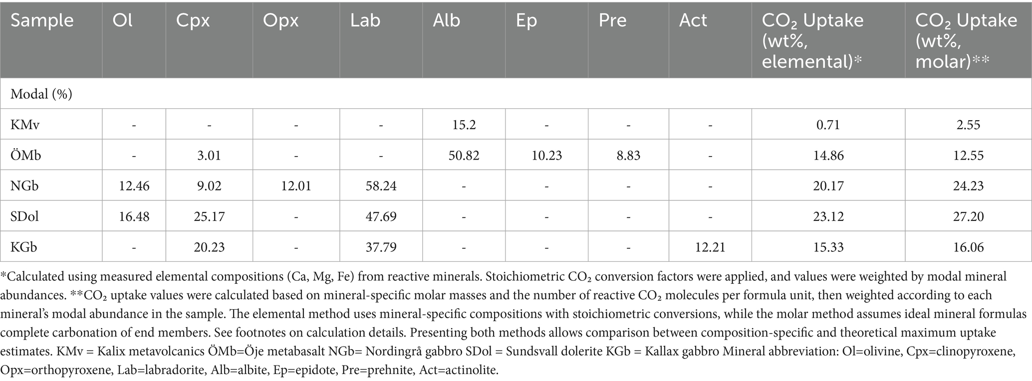 Table 3. Modal abundances (%) of reactive minerals in a representative sample for each rock unit and the resulting theoretical CO2 uptake values (wt%) based on two methods.
