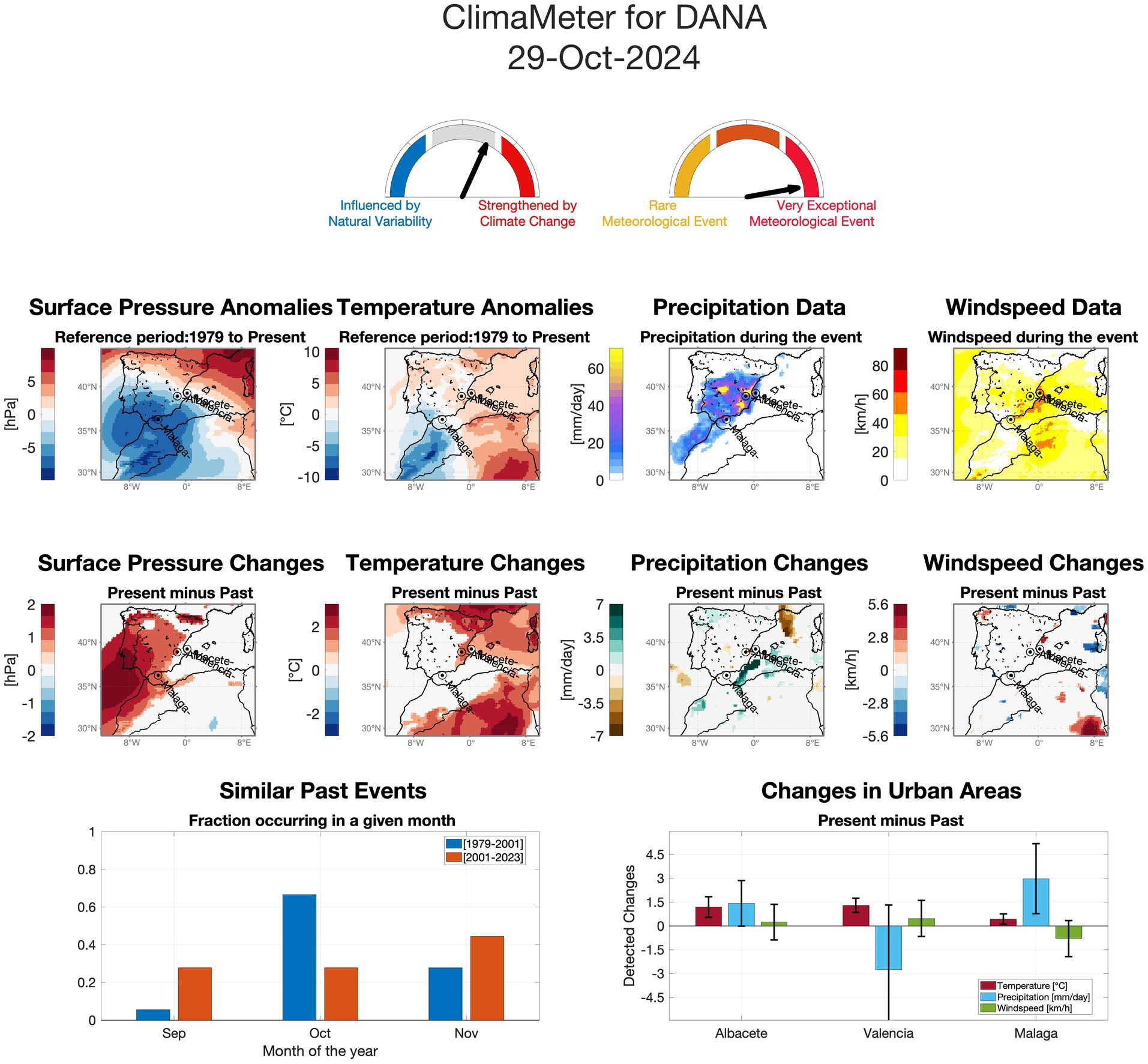 Figure 1. ClimaMeter attribution analysis for the DANA event of 29 October 2024. The top panels show surface pressure anomalies, temperature anomalies, precipitation, and wind speed during the event. The middle panels display the differences between the mean of all analog days in the present period (2001–2023) and the mean of all analog days in the past period (1979–2001) for the same variables. Significant differences are identified through a bootstrap procedure: dates from the two periods are pooled, 15 dates are randomly sampled 500 times, and grid point changes exceeding two standard deviations from the bootstrap mean are marked as significant. The lower panels show the seasonal frequency shift of similar circulation patterns between the two periods (left) and the detected changes in temperature, precipitation, and wind speed for three urban areas (Albacete, Valencia, Málaga) (right).