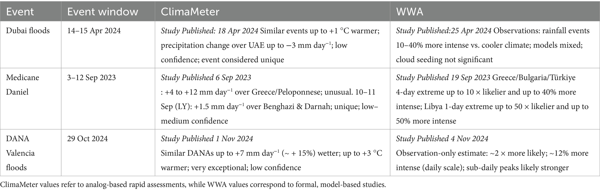 To assess the performance and added value of ClimaMeter’s near-real-time attribution analyses, we compared its outputs with those produced by the World Weather Attribution (WWA) consortium for three recent high-impact precipitation events: the Dubai floods of April 2024, Medicane Daniel in September 2023, and the Valencia (South-East Spain) floods of October 2024. These cases were selected because they represent distinct meteorological settings—desert flash flooding, Mediterranean cyclone, and autumnal DANA event—while being covered by both ClimaMeter and WWA, allowing a direct, event-by-event comparison in terms of timing, attribution signal, and overall agreement (Table 1).