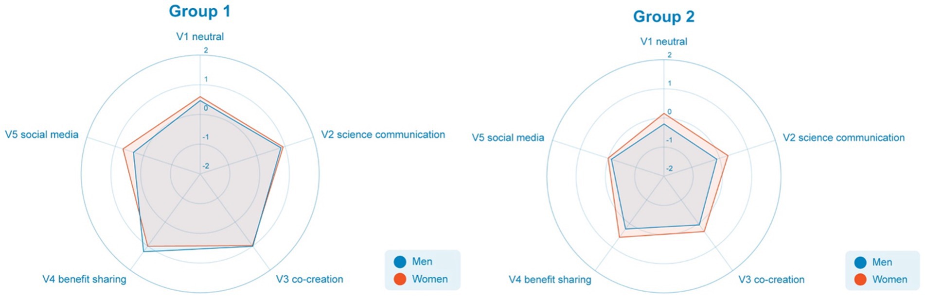 Figure 1. Radar chart distribution of perception rates by group (1/2) and gender (male/female). Values correspond to: V1 neutral, V2 science communication, V3 co-creation, V4 benefit sharing, V5 social media.