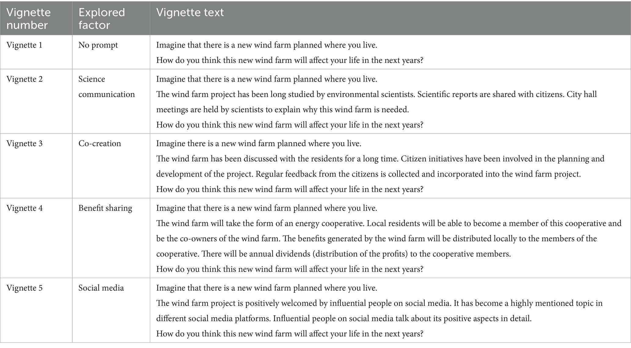 A total of five vignettes were developed. The first, adapted from the Special Eurobarometer 516 (European Commission, 2021), was neutral in tone and designed to measure baseline attitudes toward wind farms. The remaining four vignettes each introduced one of the selected trust-building strategies: (1) science communication, (2) co-creation, (3) benefit sharing, and (4) social media (see: Table 1). Each strategy was isolated in its respective vignette to assess its distinct impact on public perceptions.