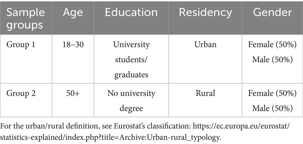 To facilitate a clear analysis of differences in trust and attitude formation, the study employed a purposive sampling strategy. Two contrasting sub-samples—Group 1 and Group 2—were constructed based on sociodemographic factors known to correlate with trust in science. Group 1 consisted of university students and graduates aged 18–30, living in urban settings and presumed to hold higher baseline trust in science. Group 2 included participants over the age of 50, with no university degree and residing in rural areas, who were expected to display greater skepticism.