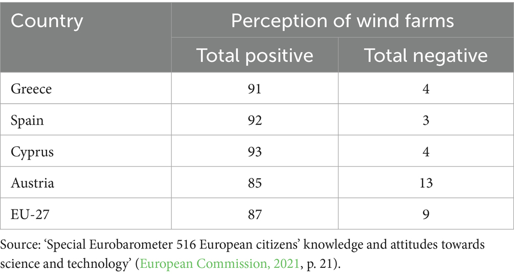 Data collection was conducted in four European countries—Austria, Cyprus, Greece, and Spain. Country selection was primarily informed by logistical feasibility, as members of the VERITY consortium were based in these locations and were thus able to facilitate data collection, including in geographically remote rural areas. Beyond practical considerations, these countries also exhibited comparable public attitudes toward wind energy, the focal topic of the study. According to the Special Eurobarometer 516: European citizens’ knowledge and attitudes towards science and technology (European Commission, 2021, p. 21), public perceptions of wind energy in all four countries aligned closely with the EU27 average, indicating a shared baseline of moderate support. Nonetheless, we acknowledge a limitation in this selection: Austria recorded a slightly higher rate of negative perceptions toward wind energy compared to the other three countries. The historical trajectories of wind energy adoption also differ across the four countries studied. The first European wind farm opened on the Greek island of Kythnos in 1982 (Wind Europe, n.d.). Greece experienced continuous growth during the 1990s–2000s, reaching over 5.5 GW by 2025 (Hellenic Wind Energy Association (HWEA), 2025). Spain began developing modern wind farms in the early 1990s and now exceeds 30 GW of installed capacity. In 2023, wind energy became the country’s largest source of electricity, covering over 24% of national demand. Spain ranks fifth worldwide and second in Europe (after Germany) in total installed wind capacity (Spanish Wind Energy Association, n.d.). Austria entered the modern wind-energy phase in the mid-1990s, with steady expansion and growth thereafter (Jaksch-Fliegenschnee et al., 2022). By contrast, Cyprus is a late wind energy adopter. Its first large-scale facility was commissioned in 2010–2011. Since then, it has marked a gradual national uptake with a capacity of 157.5MWe, as in 2021 (Cyprus Energy Regulatory Authority, 2022). While these divergences do not invalidate the cross-country comparison, they introduce contextual nuances that should be taken into account when interpreting the findings (Table 3).
