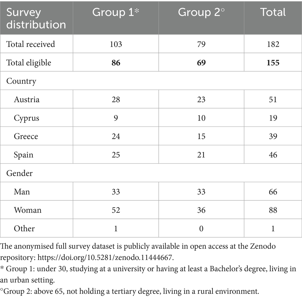 To ensure accessibility across diverse populations, the mode of administration varied: Group 1 completed the survey online via LimeSurvey, while Group 2 participants, who belonged to a harder-to-reach group, were engaged through face-to-face or telephone-assisted formats. This mixed-mode approach enabled inclusion of older rural participants who might otherwise be underrepresented. The potential influence of survey mode on response patterns was not formally examined and remains a methodological limitation of this study. Data collection was coordinated by the four national project partners, who followed shared sampling criteria while adapting the recruitment to local contexts. Each partner relied on institutional or community networks to recruit participants for Group 1 (younger, urban, university-educated) and Group 2 (older, rural, without a university degree). For Group 1 recruitment: In Austria, the Centre for Social Innovation (ZSI) distributed the survey link through university mailing lists. In Spain, the link was shared through student networks at Barcelona-based universities. In Greece, the University of West Attica (UniWA) researchers distributed the link directly to students at the University of West Attica and other Athens-based universities to ensure disciplinary diversity. In Cyprus, UCLan Cyprus distributed the survey in their own university network. For Group 2 recruitment: In Austria, ZSI organized two “research salons” with seniors in Lower Austria and Burgenland. In Spain, printed surveys were conducted through home visits in rural Granada. Two telephone interviews were conducted in this country case. In Greece, UniWA collaborators conducted printed surveys in a northern Greek village and nearby communities. In Cyprus, UCLan researchers recruited older participants from senior centres and village coffee shops in the districts of Nicosia and Larnaca. These procedures ensured cross-national consistency in methodology while accommodating demographic and logistical differences across sites.