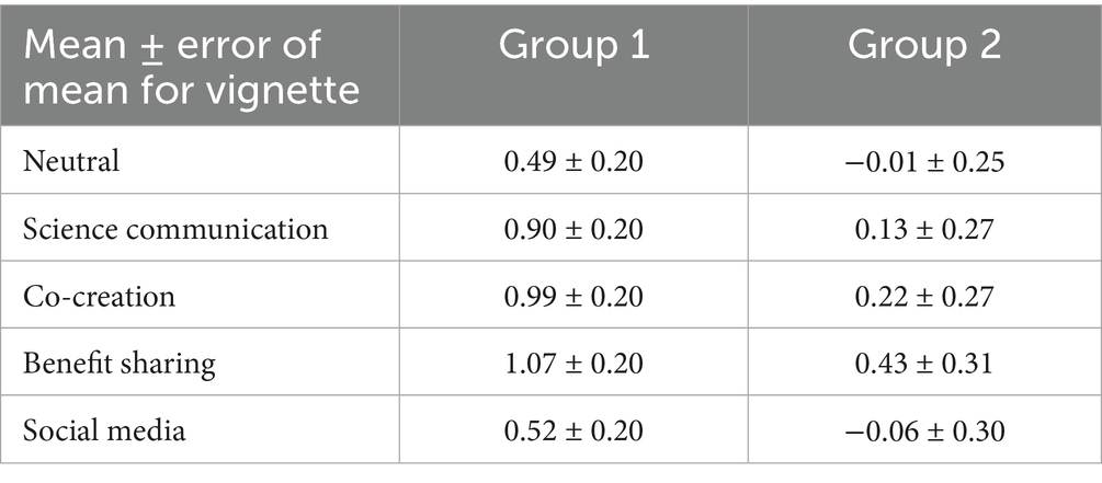 In contrast, science communication produced more gendered responses. While it was moderately effective overall, it was particularly well received by women in both groups, especially in Group 1, where the mean response reached 0.90. Men, by comparison, rated science communication lower than both co-creation and benefit sharing. These gender differences suggest that women may respond more positively to transparent, expert-led engagement framed around relational trust and local relevance (Nisbet et al., 2002; Reincke et al., 2020).
