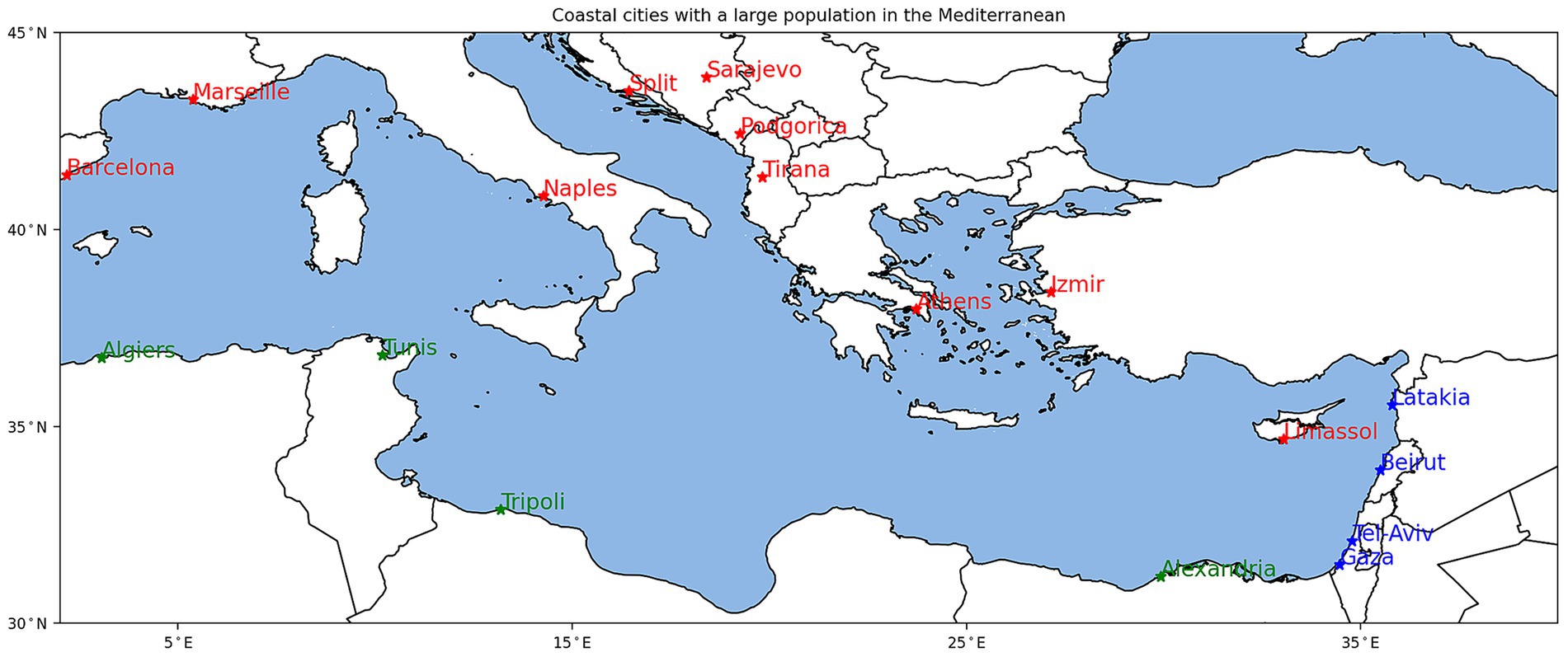 Figure 1. Map of the largest coastal cities from each of the Mediterranean countries selected. Cities from Europe are in red, from the Middle East are in blue, and from North Africa are in green.