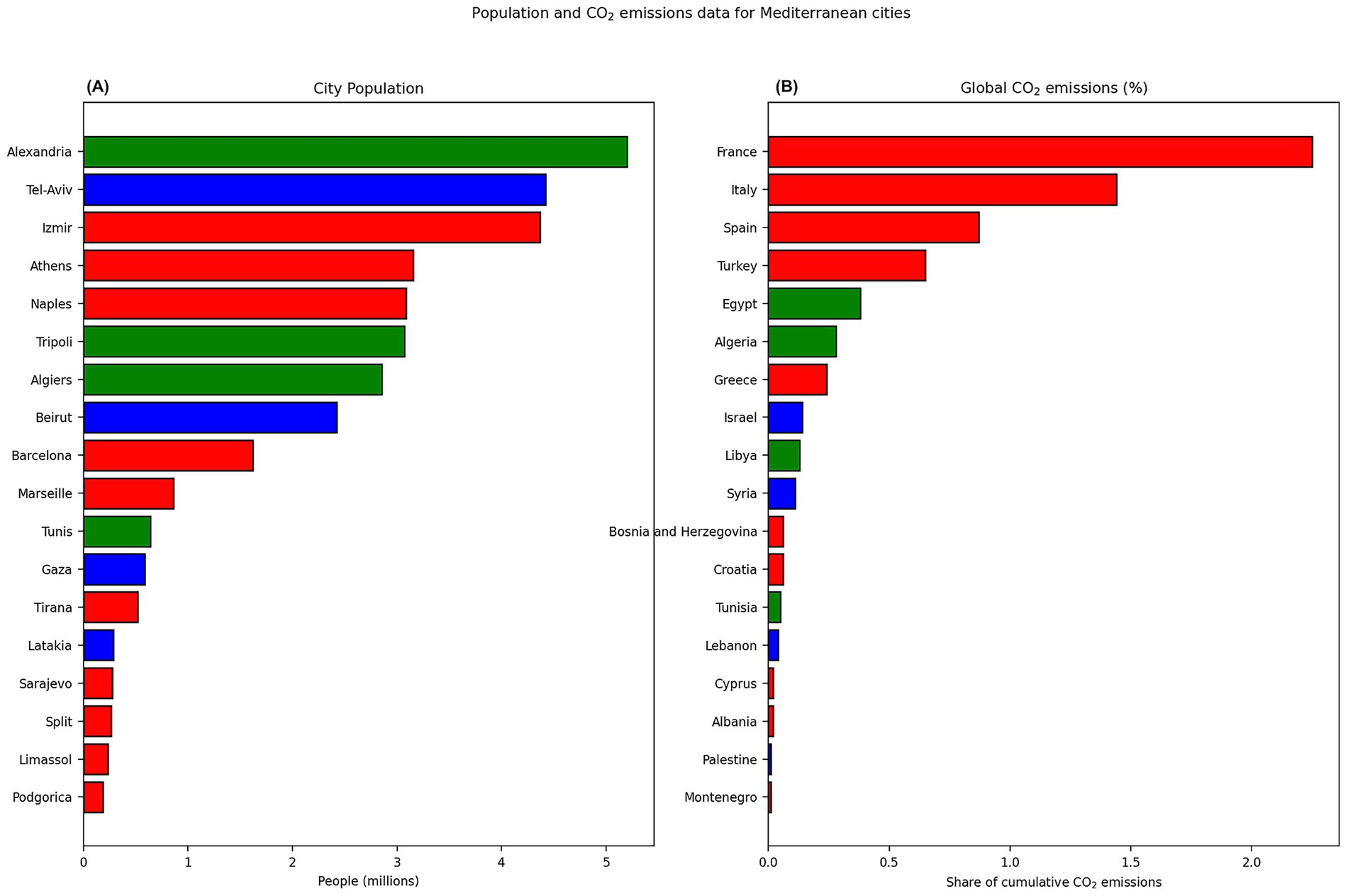 Lastly, to determine the impact on the urban coast communities, the coastal cities with the largest population from each Mediterranean country are selected (Figure 1) and split into three regions geographically, Europe (red), Middle East (blue), and North Africa (green). The populations of each of these cities are shown in Figure 2A (Brinkhoff, 2025) and compared to their respective country’s CO2 emissions in Figure 2B (Ritchie et al., 2023). This is to highlight that global warming will have a large impact on these coastal communities, despite not being a large contributor to global CO2 emissions and climate change.