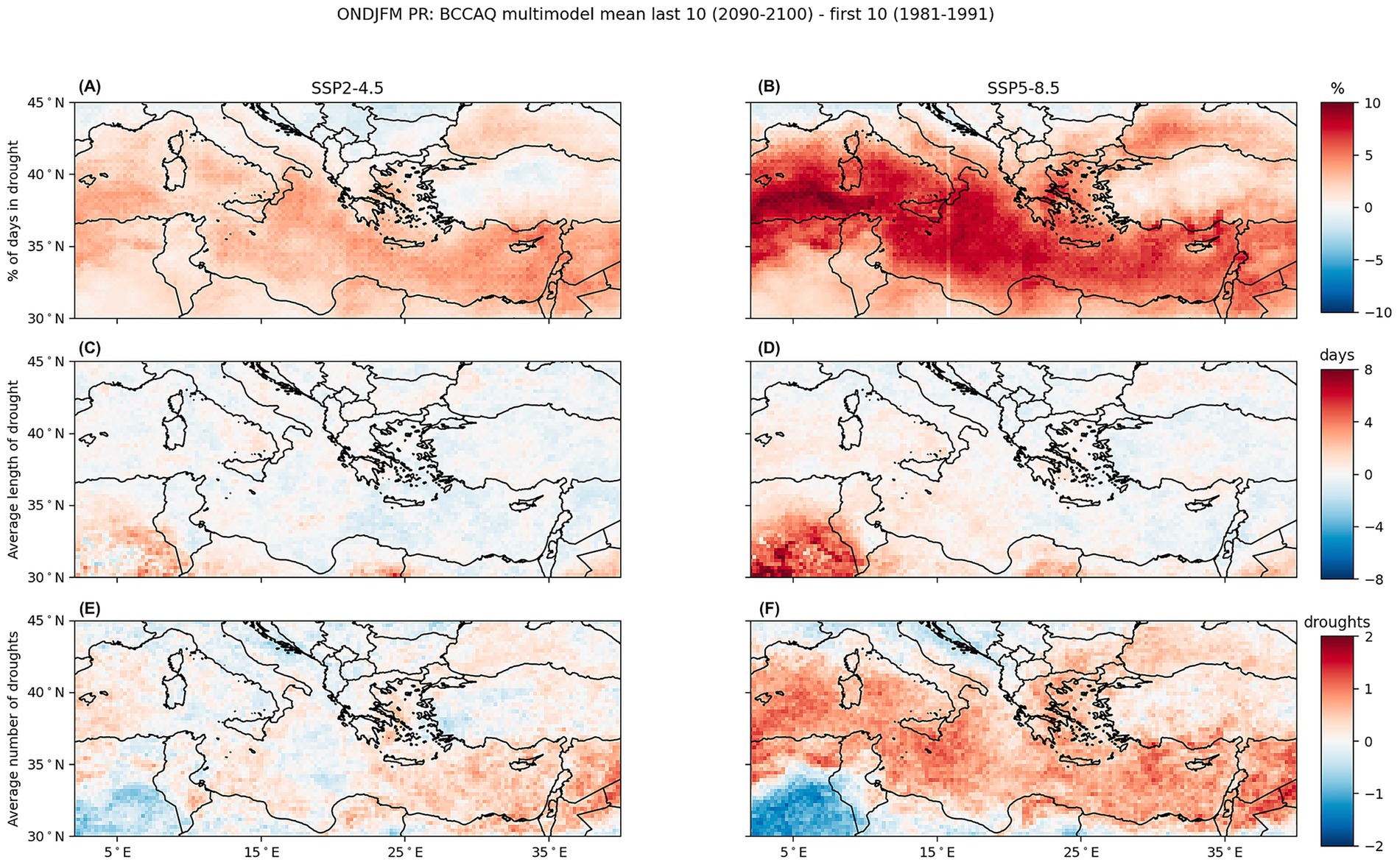 The average length of consecutive drought during ONDJFM shows an overall decrease over the Mediterranean for SSP2-4.5 (Figure 3C). At the end of the century, most of the region experiences droughts that are shorter on average by roughly 4 days compared to the first 10 years. The exception to this being western North Africa over Algeria, a signal that is seen in SSP5-8.5 as well (Figure 3D). Here there is a clear pattern that shows an increase in the length of drought over the North Africa region with some areas experiencing droughts longer by at least 8 days. The rest of the region shows negligible change, similar to what was seen in SSP2-4.5 (Figure 3C).