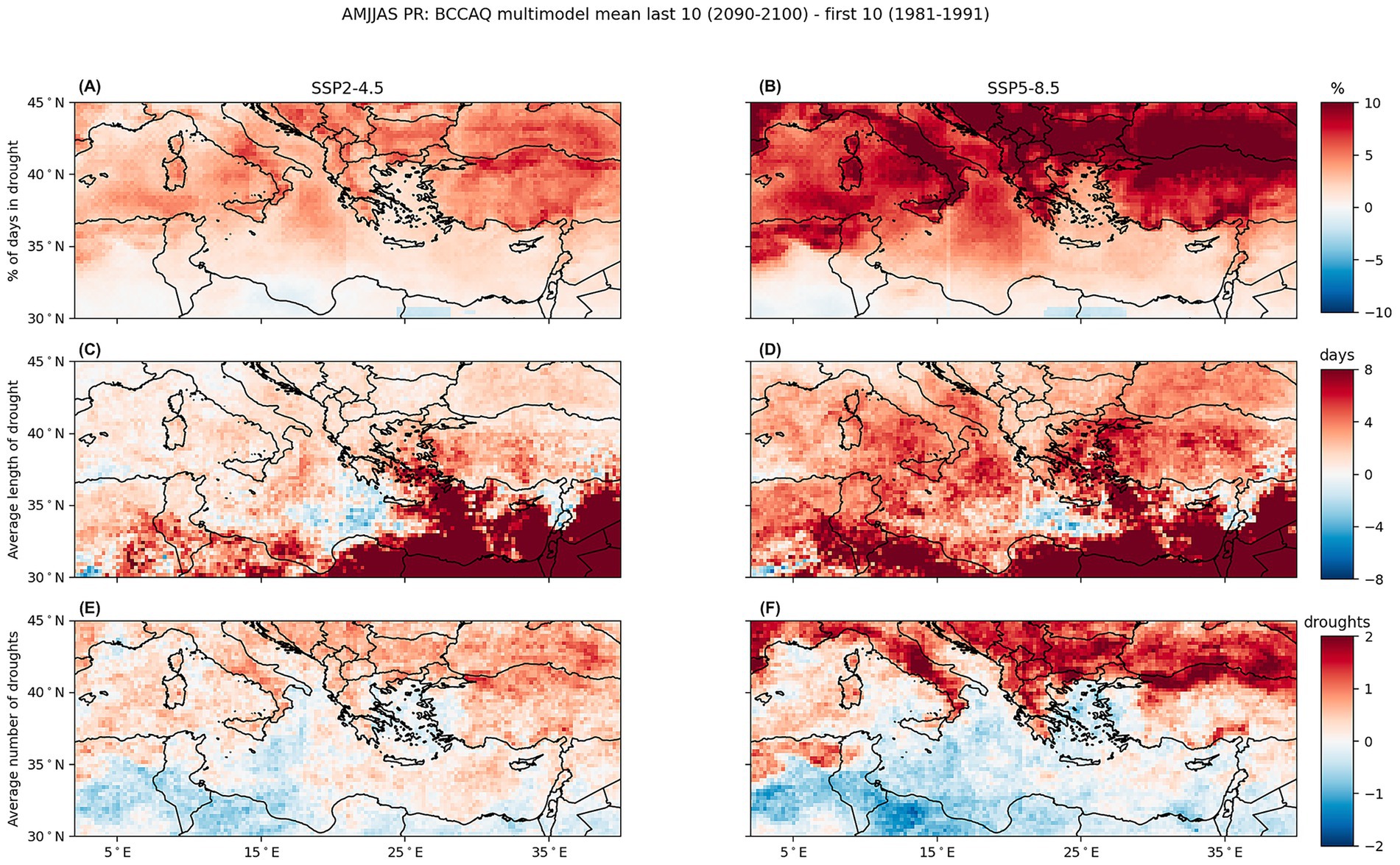 The average number of droughts for AMJJAS shows a similar pattern once more for SSP2-4.5 (Figure 4E) and SSP5-8.5 (Figure 4F), with SSP5-8.5 having a stronger signal. Overall, the Mediterranean region experiences more average number of droughts per dry season (AMJJAS) in the north over Europe and less in the south over the MENA region. Over most areas in the northern Mediterranean, there is an increase of more than two droughts during the last 10 years of the century. This signal is confined mostly to the areas with land as a negative effect is observed over the Mediterranean.