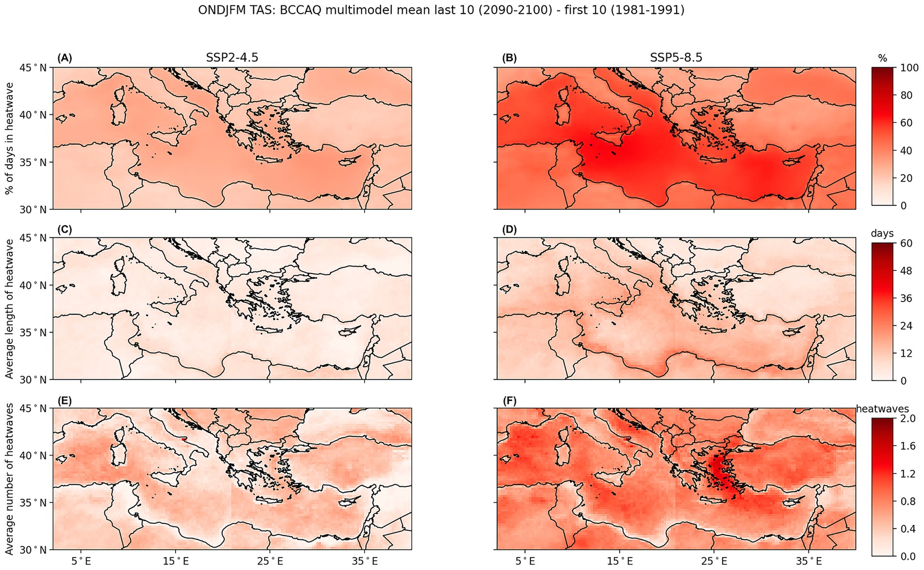 Similar to there not being a large increase in length of the heatwaves in SSP2-4.5 (Figure 5C), there is also only a slight increase in frequency of heatwaves lasting at least 7 days experienced in ONDJFM (Figure 5E). Throughout the Mediterranean, there is an increase of less than one heatwave per season on average observed with the greatest increase observed over the Eastern European region. For SSP5-8.5 (Figure 5F), however, the signal doubles compared to SSP2-4.5, with there being less than two heatwaves on average per season. The greatest increase in the number of heatwaves observed occurs over the Aegean Sea, and Turkey and Greece. The smallest change is observed along the North African coast, coinciding with the large increase in the length of heatwave observed previously (Figure 5D). With the length of the heatwaves increasing by nearly 2 months on average, this gives less room for more heatwaves to occur in the six-month period of ONDJFM.