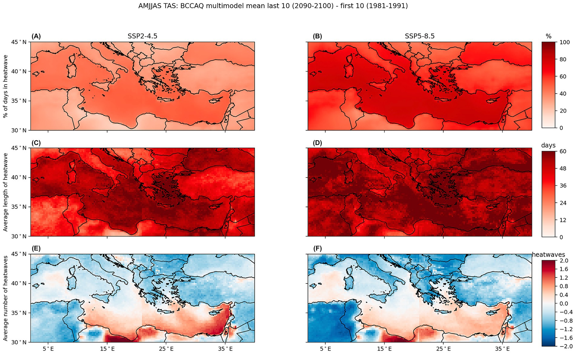 For the average length of heatwave, both SSP2-4.5 (Figure 6C) and SSP5-8.5 (Figure 6D), show strong changes over the entire region and especially over the Mediterranean Sea. For SSP2-4.5 (Figure 6C), the greatest change is observed over the Mediterranean Sea with an increase of over 50 days for the average length of heatwave observed whereas the regions over land experience an increase of roughly 30 days or less on average. This signal is much stronger in SSP5-8.5 (Figure 6D) with the entire Mediterranean region, both over sea and land, experiencing an increase in the average length of heatwave by over 60 days. This means that by the last 10 years of the century for the dry season (AMJJAS), the Mediterranean is experiencing periods of 30 consecutive days or more where the air temperature is greater than one standard deviation and a constant warming observed.
