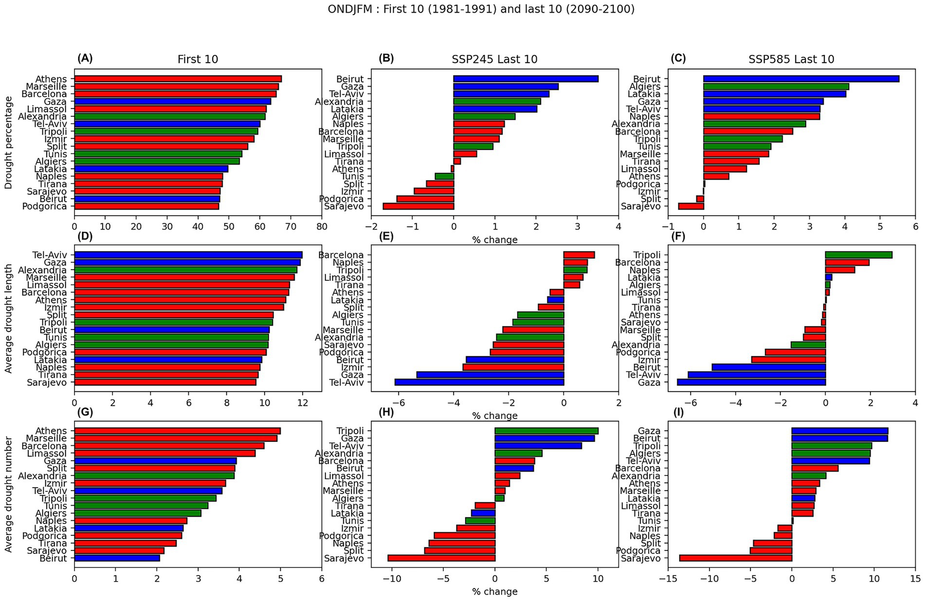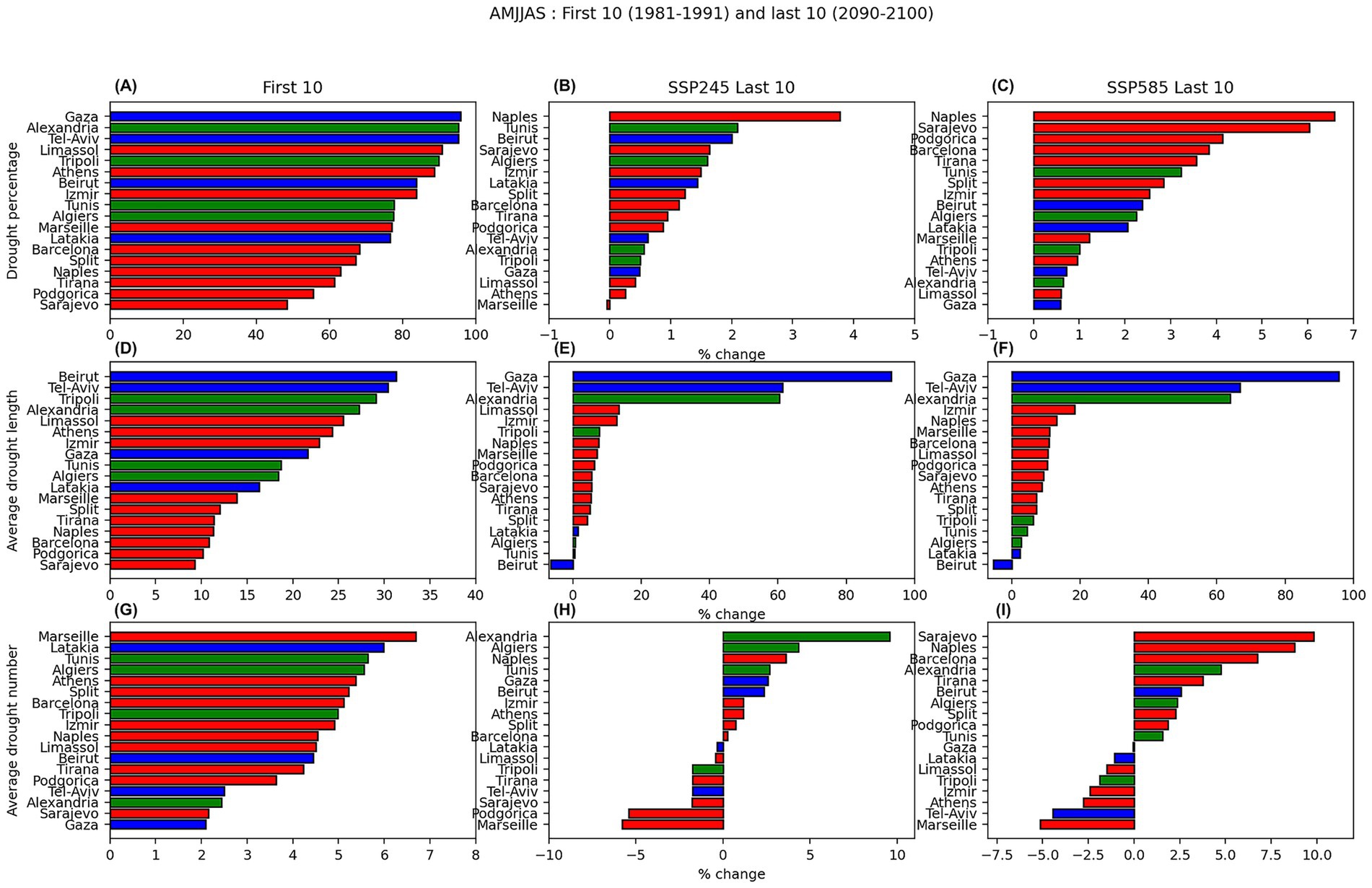Figure 8. The changes in precipitation for AMJJAS for each of the coastal cities for (A–C) drought percentage, (D–F) average drought length, and (G–I) average number of droughts. The first column (A,D,G) shows the results for the first 10 years, the second column (B,E,H) shows the percentage change from the first column to the last 10 years of SSP2-4.5, and the last column (C,F,I) show the percentage from the first column to the last 10 years of SSP5-8.5. The European cities are shown in red, the Middle Eastern cities are shown in blue, and the North African cities are shown in green.