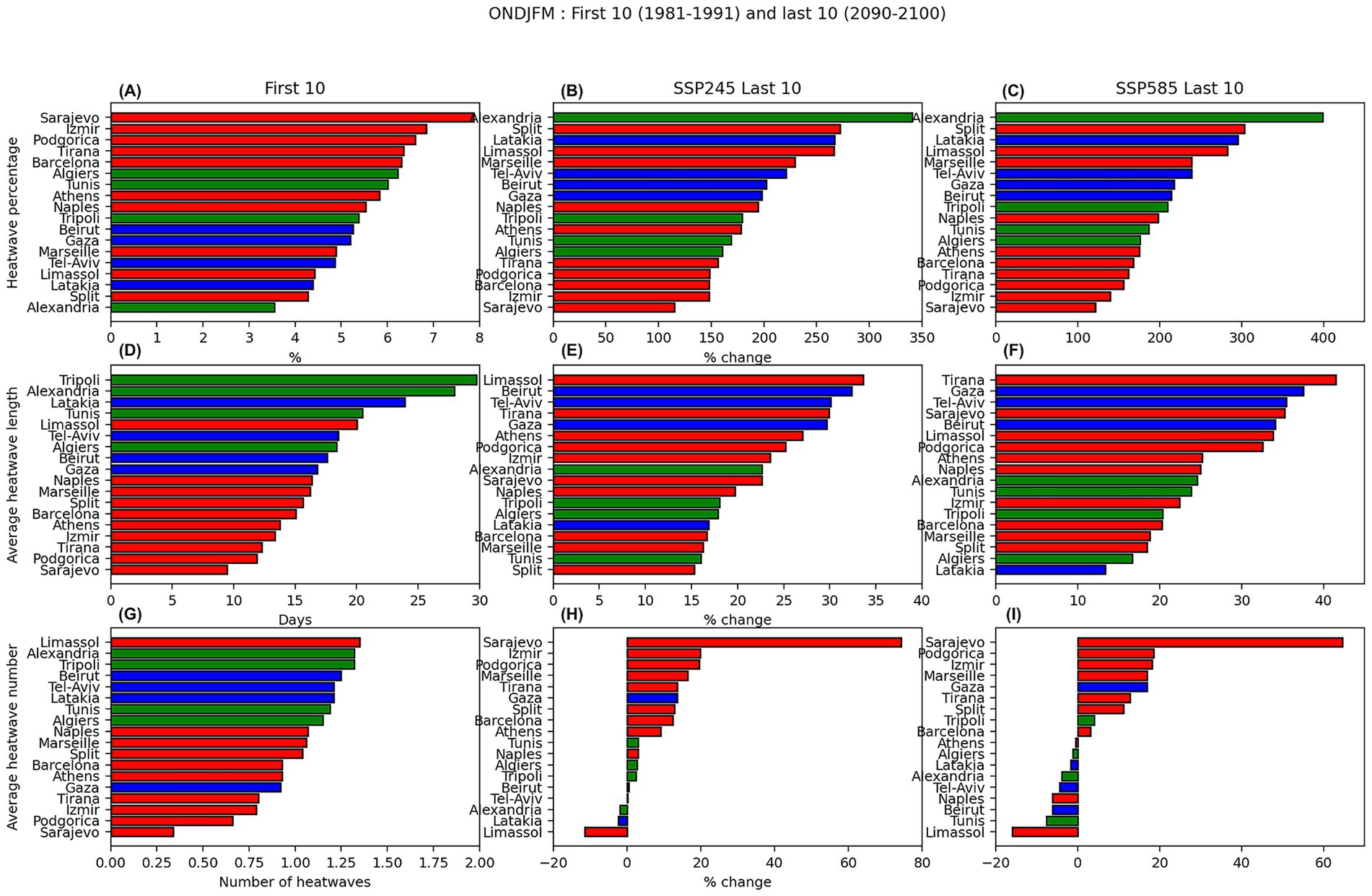 For the average number of heatwaves in ONDJFM (Figure 9G), a similar pattern to what was seen for the average length of heatwaves (Figure 9D) is observed. The cities experiencing the highest number of heatwaves are located in the MENA with the exception of the top city, Limassol, and the cities experiencing the least are in Europe. For the wet season in the Mediterranean, there is not a large range among the 18 cities, as all range from 0.25–1.50 heatwaves over the first 10 years, with again, the most in Limassol and the least in Sarajevo. For SSP2-4.5 (Figure 9E) and SSP5-8.5 (Figure 9F), the order of the cities is essentially inversed from the first 10 years with Sarajevo experiencing the largest change (over 60%) and Limassol undergoing the smallest change (−15%). Inverse from the first 10 years, most of the European cities show the largest change and most of the MENA cities show the smallest change. For the average number of heatwaves, there is a negative change observed in three cities in SSP2-4.5 and nine cities (half of the 18 considered) in SSP5-8.5, indicating that over the last 10 years some of the Mediterranean cities (mostly in the MENA region) can expect a decrease in the number of heat waves over the wet season (ONDJFM).