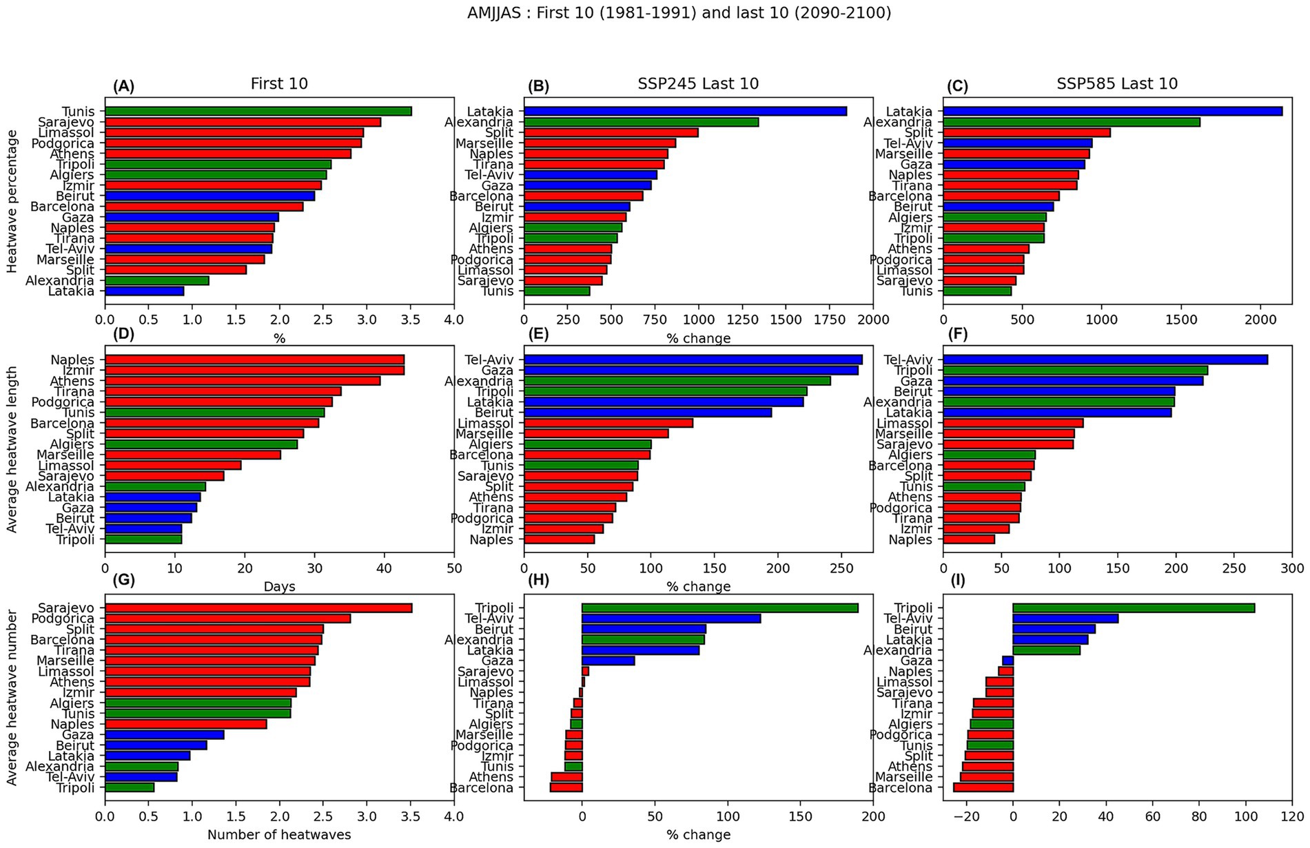 Figure 10. The changes in air-temperature for AMJJAS for each of the coastal cities for (A–C) heatwave percentage, (D–F) average heatwave length, and (G–I) average number of heatwaves. The first column (A,D,G) shows the results for the first 10 years, the second column (B,E,H) shows the percentage change from the first column to the last 10 years of SSP2-4.5, and the last column (C,F,I) show the percentage from the first column to the last 10 years of SSP5-8.5. The European cities are shown in red, the Middle Eastern cities are shown in blue, and the North African cities are shown in green.