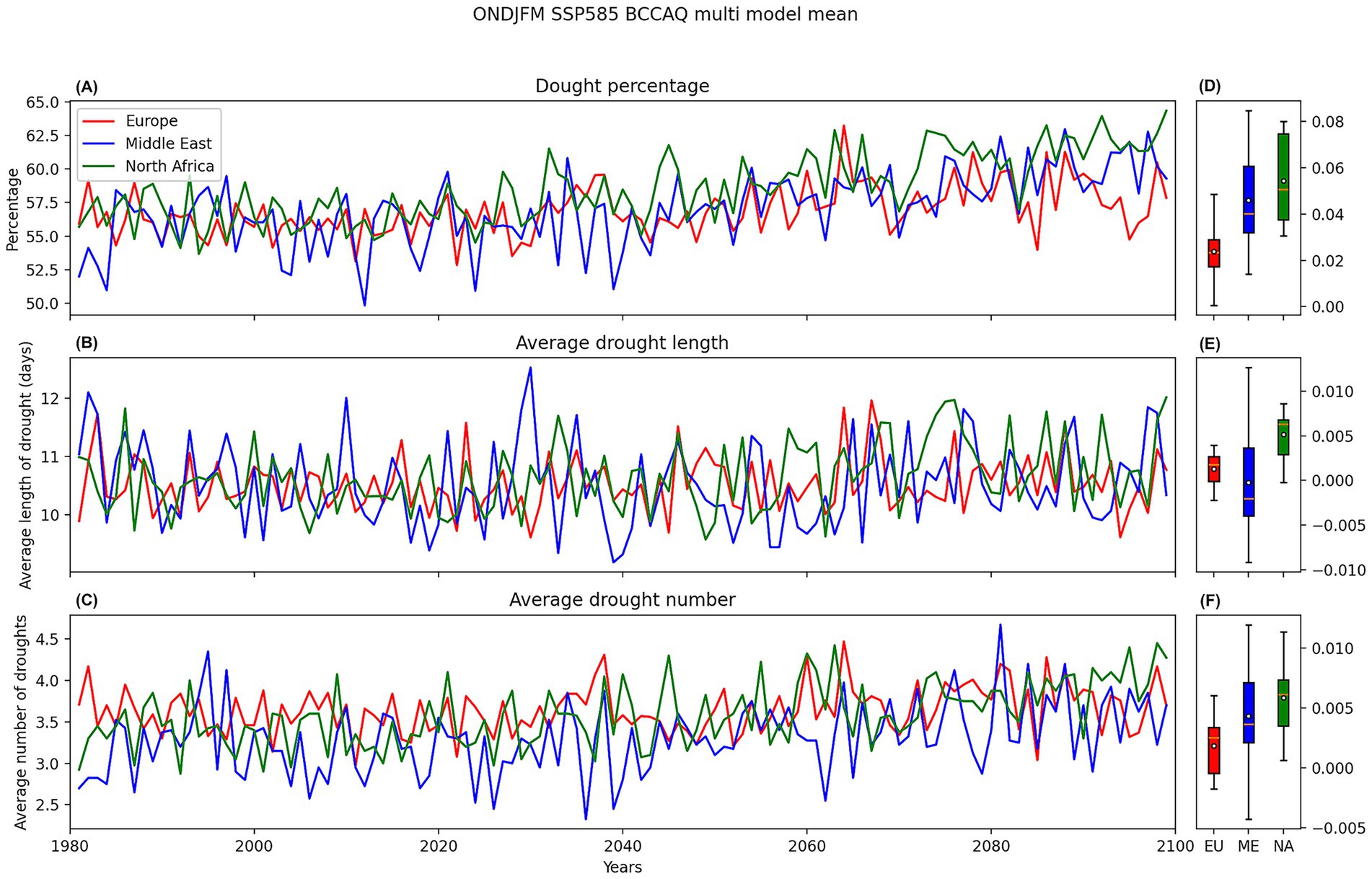 The percentage of days in a drought for the wet season (ONDJFM; Figure 11A) does not vary substantially across the three regions as they all follow similar patterns. However, by the mid-century, there is a slight increase observed until the tail-end of the century. The three regions begin with roughly 55% of the days experiencing drought conditions and increase to end with roughly 60% of the days in drought conditions. The multi-model mean of the trend (Figure 11B) is found to be positive for each region with North Africa (green) having the largest value, followed by the Middle East (blue), and lastly Europe (red). The region with the largest range in trend across all the models is the Middle East and the region with the smallest is Europe although similar to the range for North Africa. For the average length of consecutive drought (Figure 11C), however, there is no clear change in pattern observed nor is there much of a difference between the three regions for the wet season as the average length of drought is about 11 days throughout the entire time-period. The multi-model mean of the trend (Figure 11D) is found to have positive and negative values with North Africa once again having the largest value, followed by Europe and then the Middle East. Similar to before, the Middle East once again has the largest range in model trend values, whereas Europe has the smallest. All three regions have mean trends close to zero as there is a lot of noise in the timeseries showing the change in length of drought over time. Lastly, for the average number of droughts (Figure 11E), a slight increase is once again observed from the mid-century to the end of the century, similar to what was seen for the percentage of days in a drought (Figure 11A). The number of droughts per wet season increases just slightly from about 3.5 to 4 droughts. Again, similar to what was shown previously with the model trends, North Africa has the largest multi-model mean (Figure 11F), followed by the Middle East, and then the Europe, but as mentioned previously, the values are close to zero due to the noise from the timeseries. And once more, the Middle East has the largest range of trends across the three and Europe the smallest. There are both positive and negative trend values found showing the large model uncertainty, especially with respect the Middle Eastern cities.