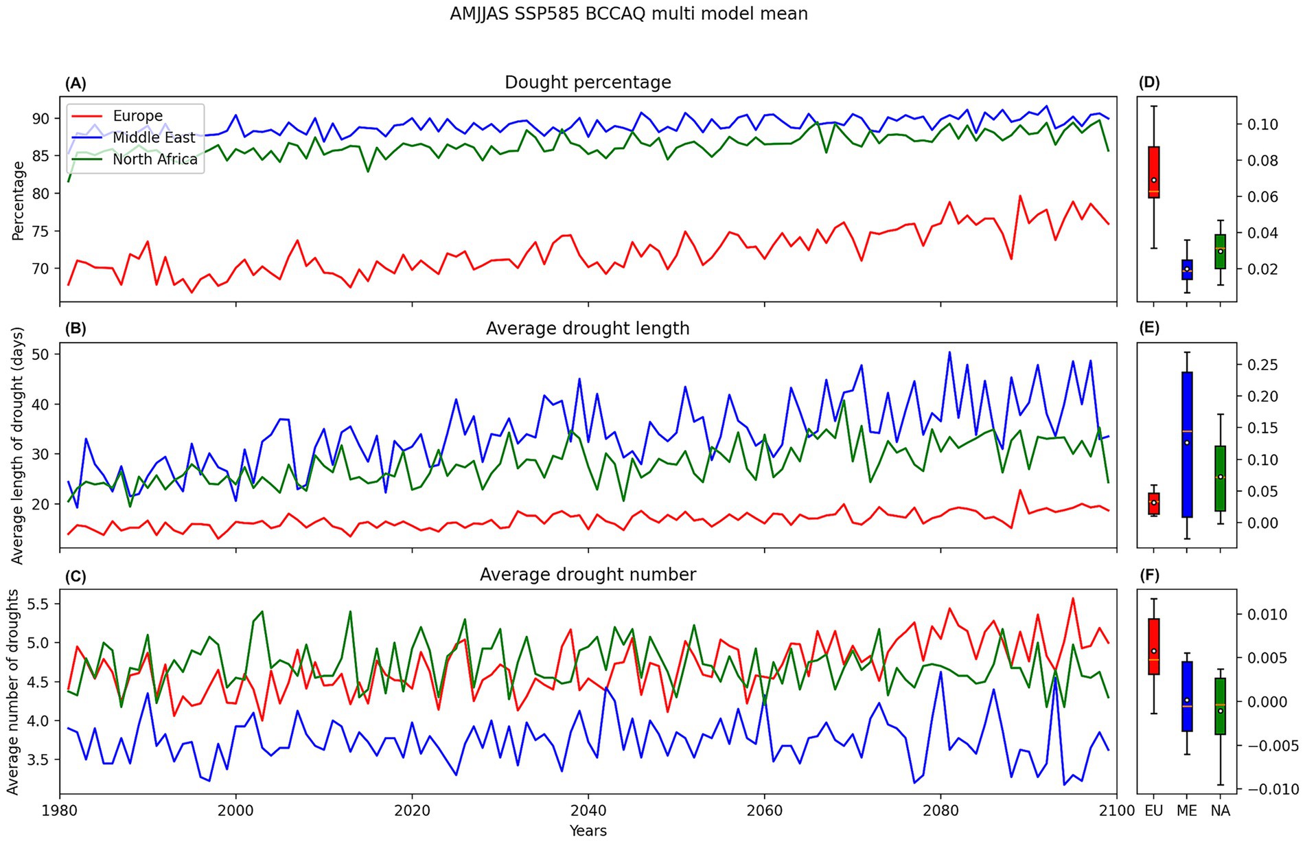 Lastly, the impact SSP5-8.5 has on the regional level (Europe, Middle East, and North Africa) is addressed for both drought and heatwave conditions during the wet and dry seasons. For the drought conditions during the wet season, there is little change observed between the three regions as there is strong variability seen. For the dry season, the scale is significantly larger and the MENA region converges on similar values while the European region tends to have smaller values. Across both seasons, however, there is a slight increase in drought conditions observed at the mid-century in all three regions. The heatwave conditions for the wet and dry season are similar for the percentage of change as the values across all three regions are the same and sharply increase toward the tail-end of the century. The dry season shows a slightly larger scale range. The average length of heatwave and average number of heatwaves for the wet season shows a minimal and slight increase in value from the beginning of the time-period to the end of the century. For the dry season, however, there is a large increase in the length of heatwave over time, and this coincides with a decrease in the number of heatwaves observed in a season over the second half of the century. The model uncertainty is also examined by looking at the trend in each model across all the variables and overall, there is a large range across all three regions with the Middle East showing the most substantial range in model trend.