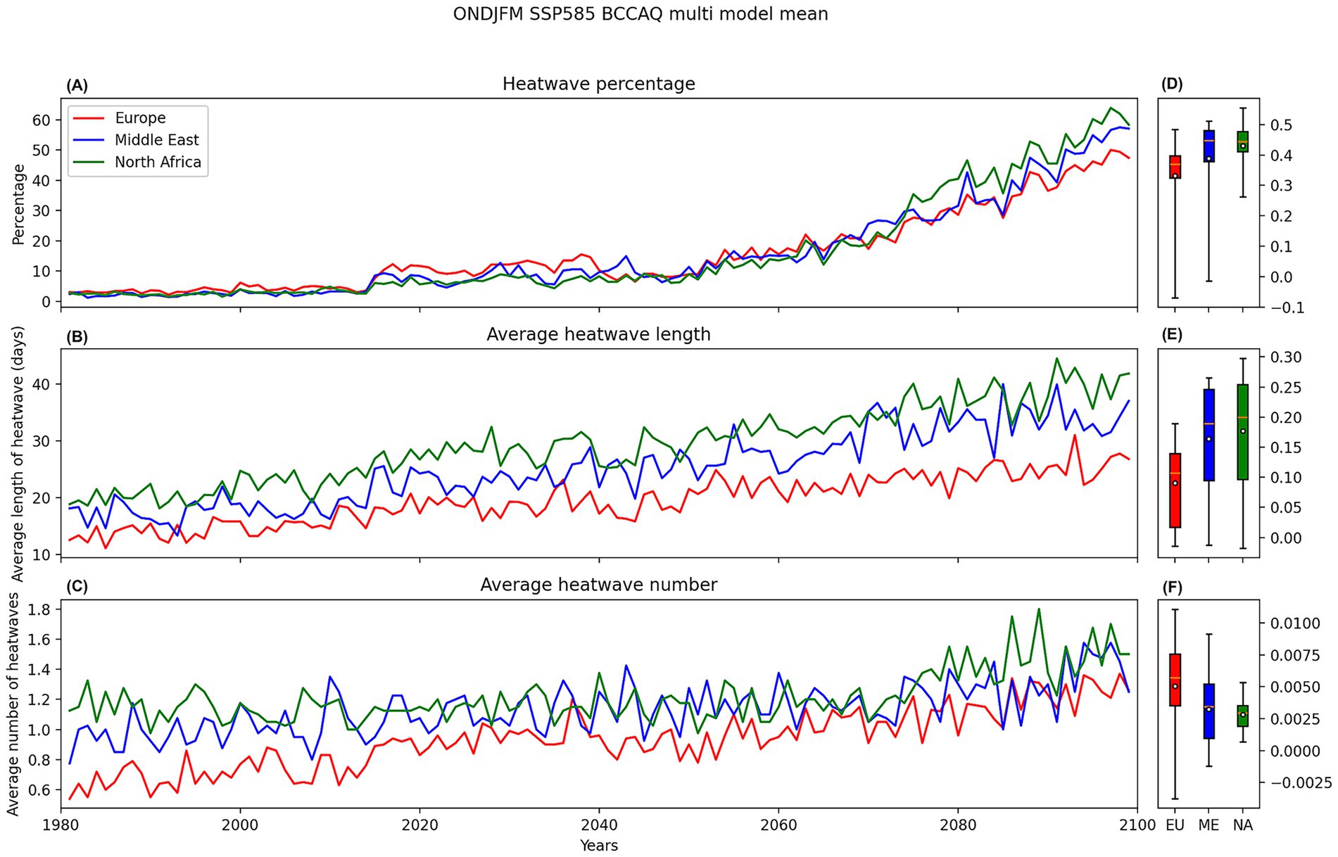 Figure 13. The regional change of air-temperature for ONDJFM for (A) heatwave percentage, (B) average heatwave length, and (C) average number of heatwaves for the entire time period of SSP5-8.5. The average of the European cities is shown in red, the Middle Eastern cities in blue, and the North African cities in green. (D–F) The range of trends for the models are shown for the minimum, first quartile, median (orange line), mean (white dot), third quartile, and maximum trend values.