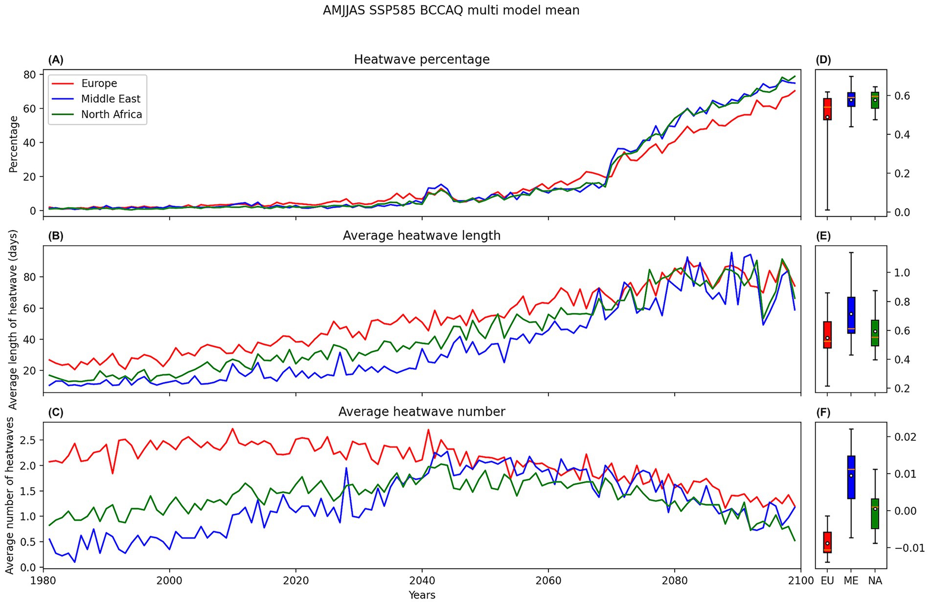 Figure 14. The regional change of air-temperature for AMJJAS for (A) heatwave percentage, (B) average heatwave length, and (C) average number of heatwaves for the entire time period of SSP5-8.5. The average of the European cities is shown in red, the Middle Eastern cities in blue, and the North African cities in green. (D–F) The range of trends for the models are shown for the minimum, first quartile, median (orange line), mean (white dot), third quartile, and maximum trend values.