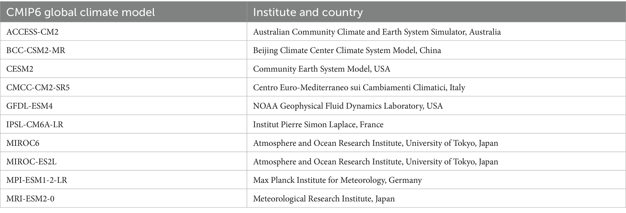Daily precipitation and air-temperature data are used in this study from 10 CMIP6 models (one ensemble member for each model) in the BCCAQ dataset (Table 1). These variables have been previously validated against the Multi-Source Weighted-Ensemble Precipitation (MSWEP) and Multi Source Weather (MSWX) observational data sources (Beck et al., 2017, 2019, 2022; Gebrechorkos et al., 2023). Data is selected from the Mediterranean region only (0–40°E, 30–45°N) for the time-period, 1981–2,100. The data is split into a historical (1981–2014) and future time-period (2015–2,100), with two future climate change projections used from the Shared Socioeconomic Pathway (SSP) scenarios found in the sixth IPCC assessment report (Kikstra et al., 2022). SSP2-4.5 keeps CO2 emissions relatively low and is used as a lower bound of global warming and SSP5-8.5 is the extreme case with high CO2 emissions and is reliant on fossil fuels (O'Neill et al., 2016).