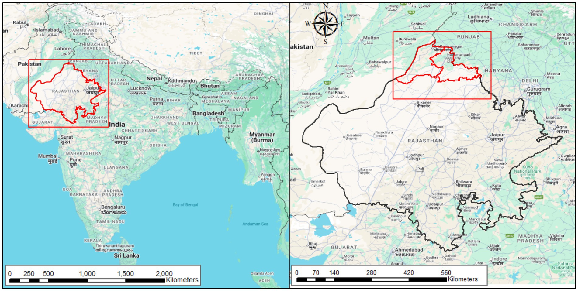 The Ganganagar district, officially known as Sri Ganganagar, is located in the northwestern part of the Indian state of Rajasthan, bordering the Indian states of Punjab and Haryana to the east and northeast, and the international boundary with Pakistan to the west. Geographically, it lies between latitude 28o42’30″ and 30o12’00″ N and longitude 72o39’15″ and 74o18’30″ E, covering an area of 11,154 km2 (Figure 1). In particular, it is located in the vast Thar Desert, and is the northernmost city of the Indian state of Rajasthan. This area is renowned for its rich cultural heritage and historical significance. The Ganganagar District is also a major agricultural area, whose crop yields sustain the local economy. Instead, the northern part of the district is covered by forest (Government of Rajasthan, 2022; National Remote Sensing Centre, 2019).