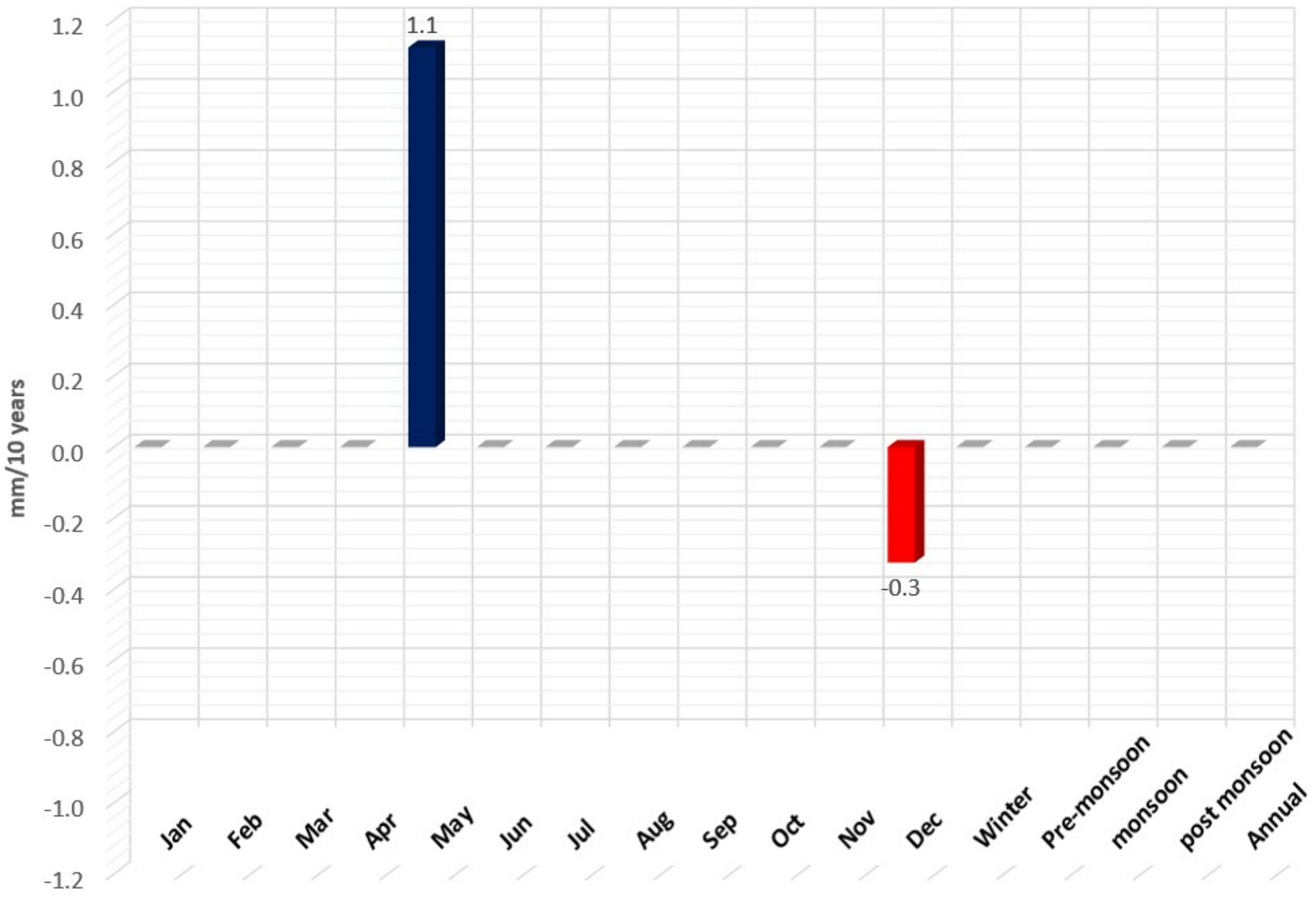 The results indicate a statistically significant increasing trend in the May precipitation (+1.1 mm/10 years, an increase of about 12% than the monthly average), while December shows a decreasing trend (−0.3 mm/10 years, a decrease of about 9% than the monthly average). No significant changes are observed in other months or seasons, and the annual trend remains nearly stable. This suggests that precipitation variability is concentrated in specific transitional months, particularly during the pre-monsoon (May) and post-monsoon (December) periods.
