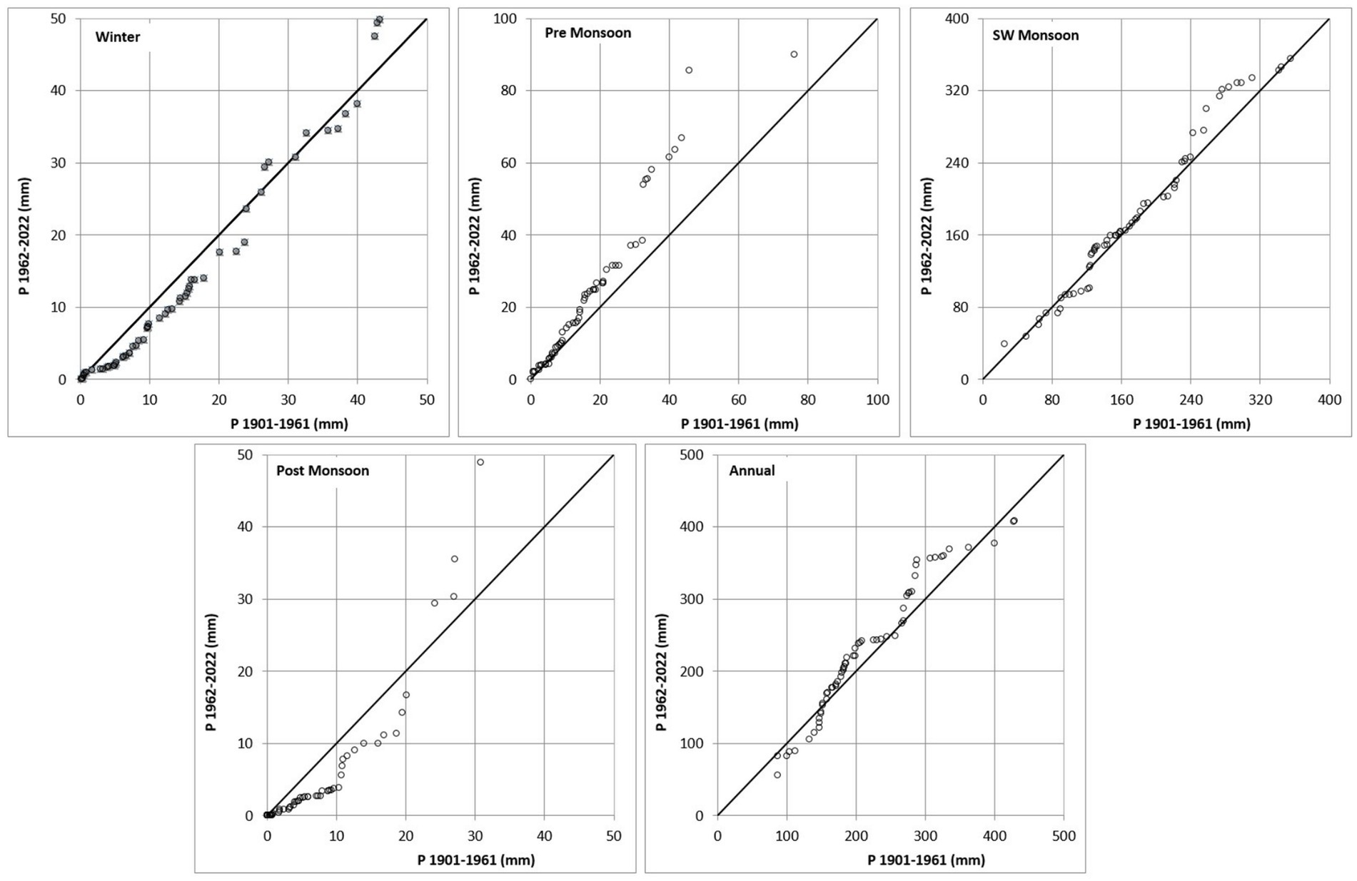 Each subplot corresponds to a specific season or the annual average (Winter, Pre-Monsoon, SW Monsoon, Post-Monsoon, and Annual). As a result, the Pre-Monsoon and Post-Monsoon seasons show a clear shift of many points above the 1:1 line, indicating an upward trend in precipitation. The SW Monsoon and the Annual precipitation show a relatively balanced distribution around the diagonal, though slight increases are observable at higher values. The winter precipitation appears to align closely with the 1:1 line, suggesting minimal overall change. These patterns highlight varied seasonal responses to long-term climatic shifts, with more prominent changes during transitional (pre- and post-monsoon) periods.