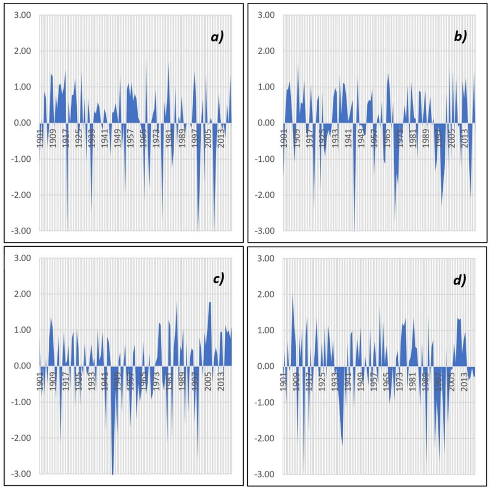 Figure 4. 3-month SPI (1901–2022) of Ganganagar district. (a) October-December, (b) January-March, (c) April-June, and (d) July-September.