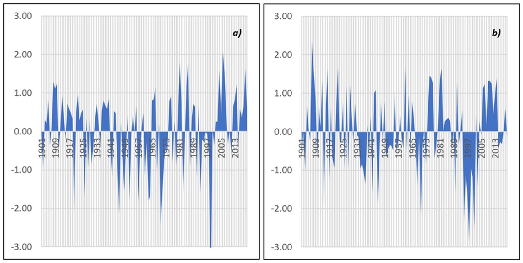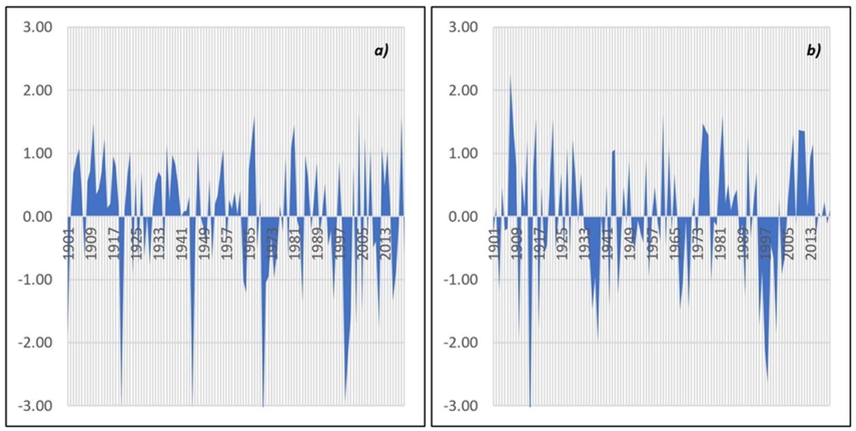 Figure 6. 9- and 12-month SPI (1901–2022) of the Ganganagar district. (a) the 9-month SPI and (b) the 12-month SPI.
