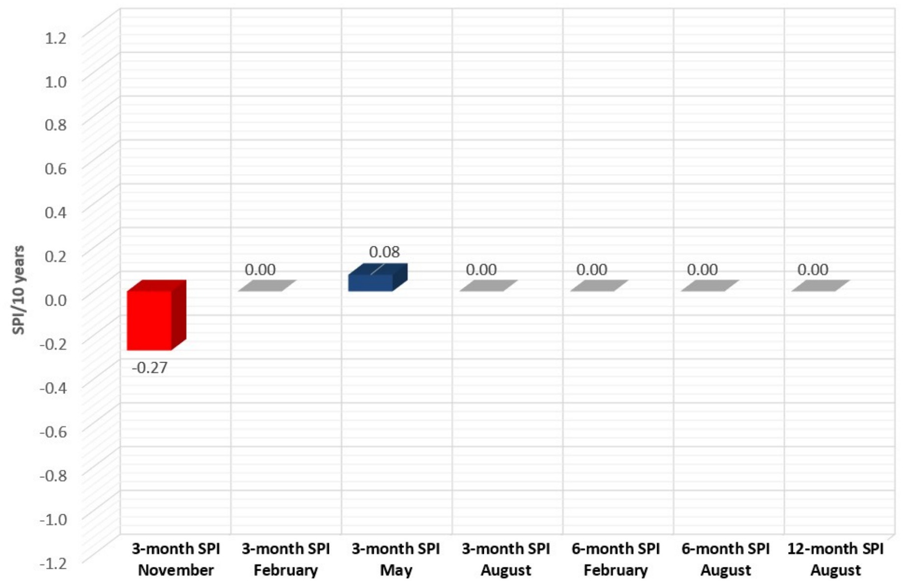 The bars indicate the magnitude of the trend (SPI units per decade), with blue representing statistically significant positive trends, red denoting significant negative trends, and grey indicating non-significant trends. A significant decreasing trend is observed in the 3-month SPI for November (−0.27 SPI/decade, more than 100% than the average SPI value in the period), suggesting increasing dryness in the post-monsoon season. In contrast, the 3-month SPI for May shows a slight but significant increasing trend (0.08 SPI/decade, about 10 times than the average SPI value in the period), possibly pointing to improving pre-monsoon moisture conditions. Other SPI time scales, including February and August (3- and 6-month), and the 12-month SPI, show no significant long-term changes. This indicates that rainfall-related drought risk is most dynamic during transitional months rather than on longer accumulation periods, thus highlighting the temporal and seasonal variability in drought patterns in the region.