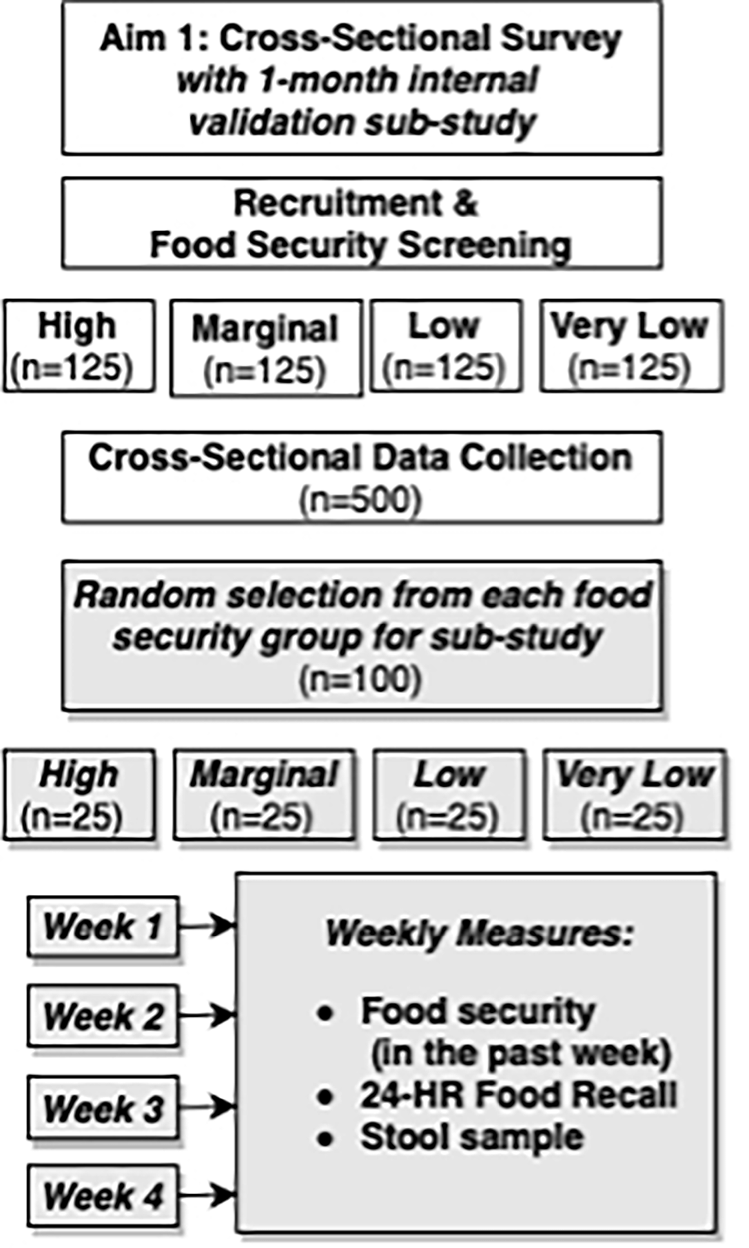 Upon completion of the cross-sectional study, participants will be randomly selected within their food security group for an invitation to participate in a 4-week observational sub-study. Elucidating the influence of food insecurity on dietary intake presents an important methodologic challenge because intake estimates from those with low and/or very low food security may potentially have higher error as compared to those with high or marginal food security. These differences in error may be due to wider fluctuations in food access throughout each month (101) and seasonally (102) for food insecure groups. Therefore, the primary purpose of the sub-study is to collect replicate dietary recalls to obtain a more precise estimate of usual dietary intake for each food security group, in addition to exploring how food security fluctuates from week-to-week. Trained interviewers will collect replicate dietary recalls and food security surveys via phone. At sub-study enrollment, subjects will receive a printed guide illustrating standard food units of measure for reference during phone calls to improve reporting accuracy.