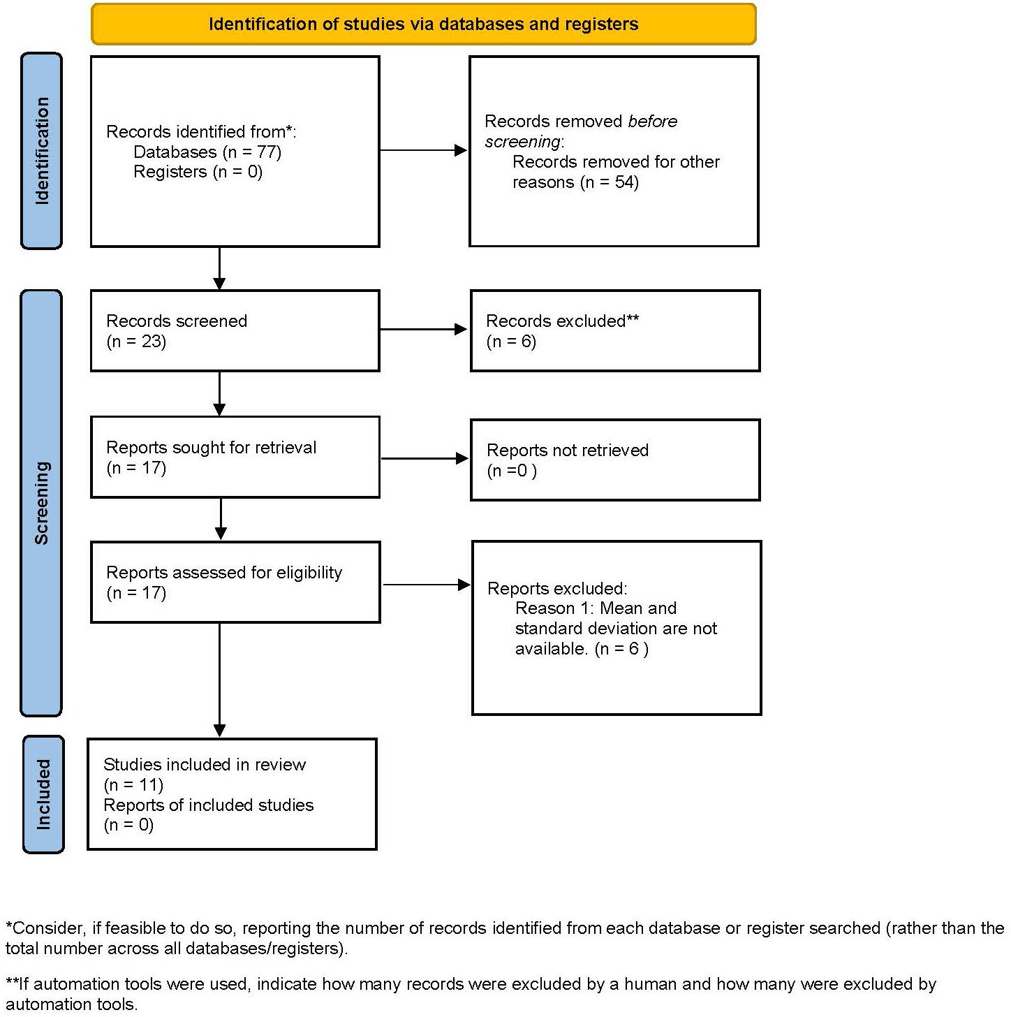 We assessed changes in HbA1c levels and CRP from baseline to post-treatment as primary outcomes, reflecting treatment-related improvement. Weighted mean difference and corresponding 95% confidence intervals (CI) were calculated by the forest plot. A random effect model was employed, and studies were weighed by a classical inverse variance method (15). Heterogeneity was examined using I2 value. Review Manager (Revman) version 5.4 for Windows from Cochrane collaboration was used to perform all analyses. Statistical significance has been defined as a P value < 0.05.