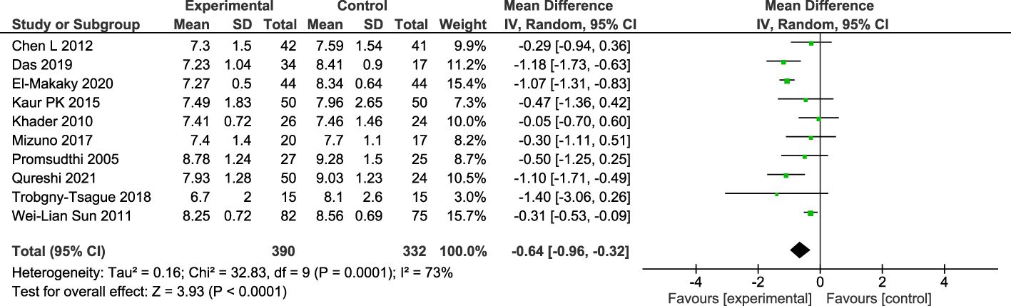 There were 10 studies included in the meta-analysis of HbA1c changes in 3 months (16–21, 23–26). A total of 332 subjects in the control group and 390 subjects in the treatment group were analyzed for changes of HbA1c levels using random effect model. There was a statistically significant difference between patients in control group and treatment group with a result of -0.64 (CI95%=-0.96; -0.32). The between study heterogeneity was considered moderate; I2 = 73% (Figure 3).