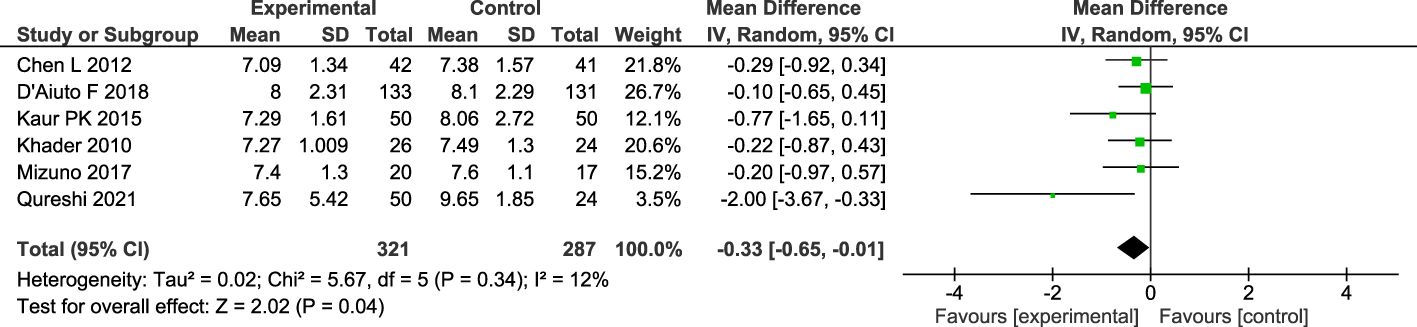 As for 6 months changes in HbA1c, there were 6 studies (16–19, 22, 24) included in the meta-analysis. A total of 287 subjects in the control group and 321 subjects in treatment group were analyzed using random effect model. There was a statistically significant difference between patients in the control group and treatment group with a result of -0.33 (CI95%=-0.65; -0.01). The between study heterogeneity was considered low; I2 = 12% (Figure 4).