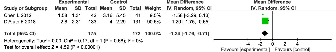 As for 6 months changes in CRP, there were 2 studies included in the meta-analysis of CRP changes in 6 months (22, 24). A total of 172 subjects in the control group and 175 subjects in treatment group were analyzed using random effect model. There was a statistically significant difference between patients in control group and treatment group with a result of -1.24 (CI95%=-1.76; -0.71). The between study heterogeneity was considered low; I2 = 0% (Figure 6).
