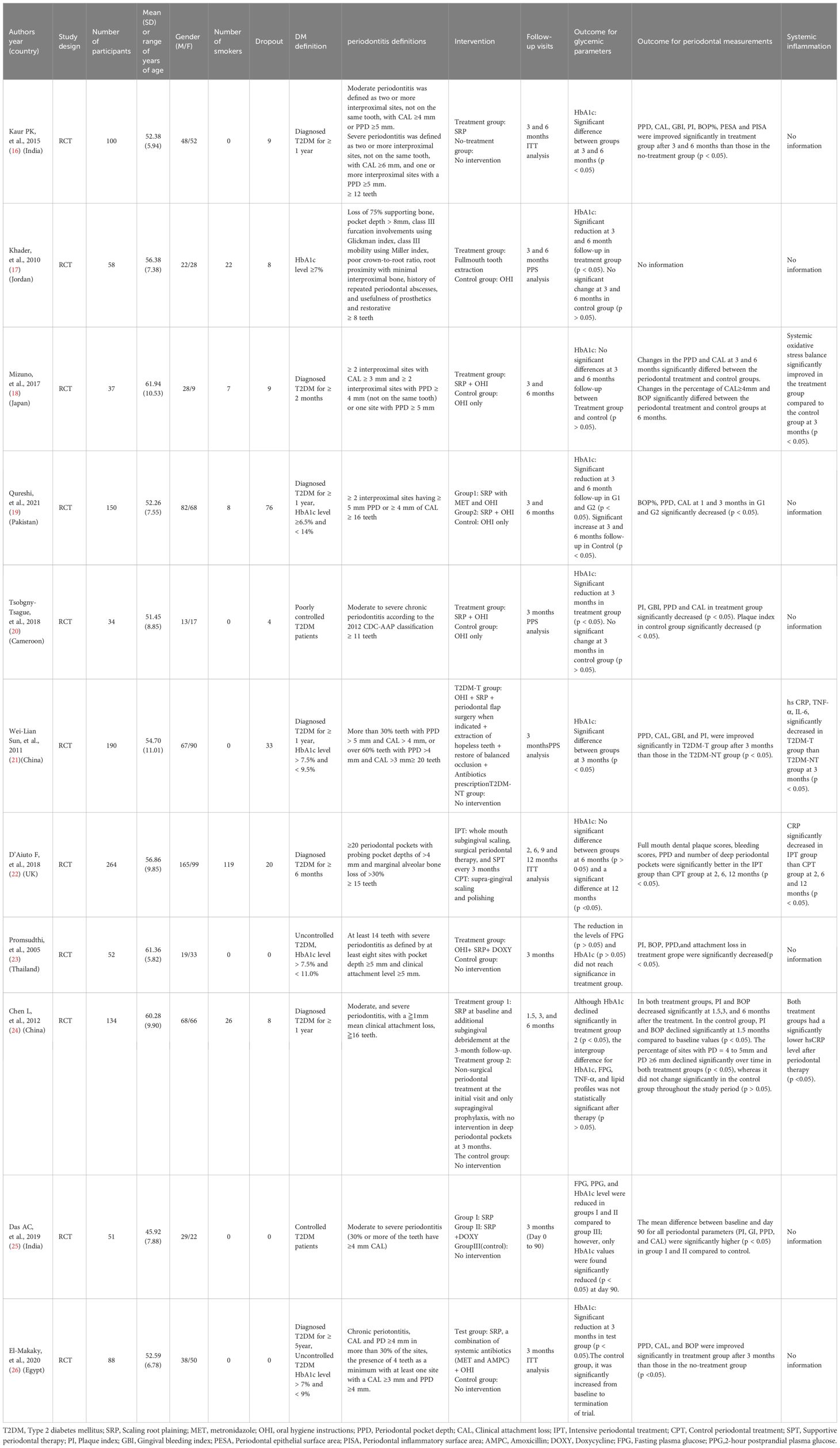 Two authors independently extracted the required data. The following information was collected: first, the year of publication; second, the authors’ names; and third, the study title. Data on changes in HbA1c, CRP, PCR, BoP, and PPD were compiled. Some studies also reported hs-CRP results, which were extracted as well. The results and conclusions of each study were summarized to facilitate easier comparison and make the findings more readily accessible. Quality assessment was conducted in accordance with Cochrane guidelines (14). Any disagreements between the two authors were resolved through discussion with the corresponding author to reach a consensus.