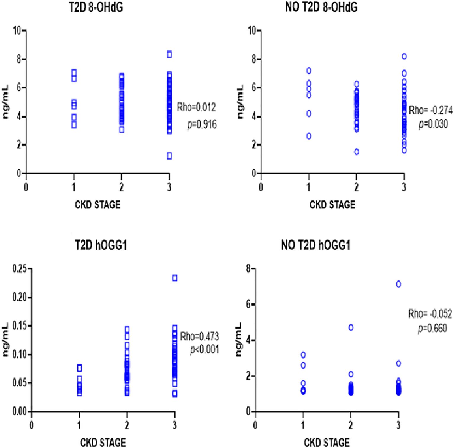 A correlation analysis was performed to identify associations between levels of oxidative DNA damage, the repair enzyme, and CKD progression. An increase in hOGG1 concentration was directly proportional to CKD stage progression in patients with T2D (rho=0.473, p<0.001). On the other hand, patients without T2D showed no significant correlation between hOGG1 levels and CKD stage (rho=-0.052, p=0.660). Oxidative DNA damage showed an inverse correlation between 8-OHdG levels and CKD progression in patients without T2D (rho=-0.274, p=0.030). However, patients with T2D showed no correlation between oxidative DNA damage and CKD stage progression (rho=0.012, p=0.916). Figure 1.