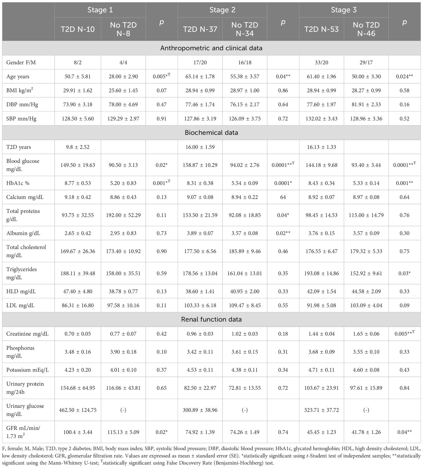 This study included 100 patients with T2D and 88 patients without T2D. Of these, 81 were men and 107 were women. The mean age of the patients was 51.77 ± 22.02 years. The duration of T2D in stage 1 patients was 9.8 ± 2.52 years, in stage 2, 16.00 ± 1.59 years and in stage 3, 16.13 ± 1.33 years. 13 patients without T2D and seven with T2D consumed alcohol. 38 patients without T2D were smokers and 55 with T2D. Eight patients without T2D were in stage 1, 34 in stage 2 and 46 in stage 3. Of the patients with T2D, 10 were in stage 1, 37 in stage 2 and 53 in stage 3. Body mass index (BMI) and SBP and DBP values were similar in all included patients. Hyperglycemia was significant in all three stages of kidney disease in patients with T2D, (stage 1, 149.50 ± 19.63 mg/dL vs. without T2D, 90.50 ± 3.13 mg/mL (p=0.02), stage 2, 158.87 ± 10.29 mg/dL vs. without T2D 94.02 ± 2.76 mg/dL (p=0.0001) and in stage 3, 144.18 ± 9.68 mg/dL vs. 93.40 ± 3.44 mg/dL without T2D) (p=0.0001). HbA1c was found to be increased in patients with T2D and early kidney disease (stage 1, 8.77 ± 0.53%, stage 2, 8.31 ± 0.38% and stage 3, 8.43 ± 0.14%) compared to patients without T2D (stage 1, 5.20 ± 0.83%, stage 2, 5.54 ± 0.09% and stage 3, 5.33 ± 0.14%) (p=0.0001). Total serum proteins had higher levels in patients with stage 2 T2D with 153.50 ± 21.59 g/dL vs. without T2D 92.08 ± 18.85 g/dL (p=0.04). Serum albumin levels were higher in patients with stage 2 T2D, 3.89 ± 0.07 g/dL vs. without T2D, 3.57 ± 0.08 g/dL (p=0.003). Triglycerides were slightly elevated in patients with stage 3 T2D, 193.08 ± 14.86 mg/dL vs. 152.92 ± 9.61 mg/dL in patients without T2D (p=0.03). Serum creatinine was found to be higher in stage 3 patients without T2D, 1.65 ± 0.06 mg/dL vs. 1.44 ± 0.04 mg/dL (p=0.005). Glycosuria was present in patients with T2D, stage 1, 462.50 ± 124.75 mg/dL, stage 2, 300.89 ± 38.96 mg/dL and stage 3, 323.71 ± 37.72 mg/dL. GFR was found to decrease progressively according to the stage of the disease. GFR in stage 1 T2D patients was lower 100.4 ± 3.44 mL/min/1.73 m2 vs. 115.13 ± 5.09 mL/min/1.73 m2 (p=0.02) and patients without T2D in stage 3 showed lower GFR, 41.78 ± 1.26 mL/min/1.73 m2 compared to patients with T2D, 45.45 ± 1.23 mL/min/1.73 m2 (p=0.04). Table 1.