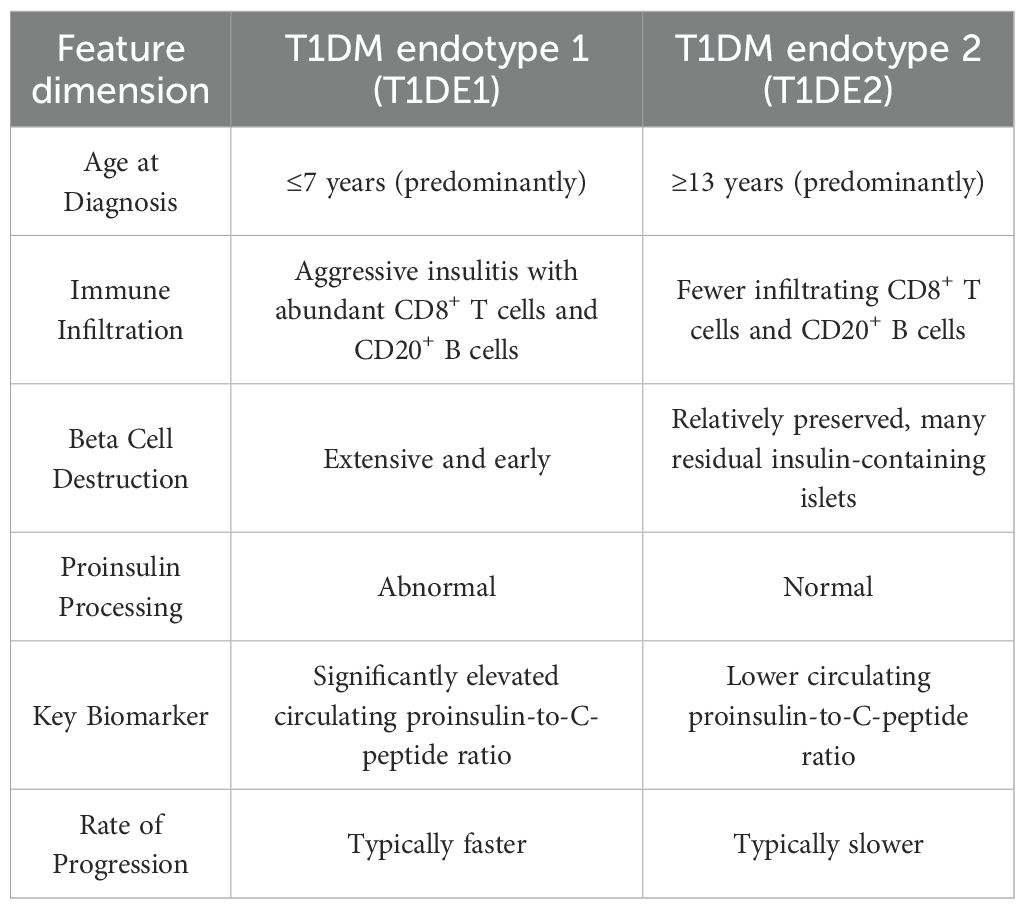 T1DM is a heterogeneous disease, and classifying patients into distinct endotypes can facilitate precision medicine. Two main endotypes, T1DE1 and T1DE2, have been proposed based on differences in immune-cell infiltration, proinsulin processing, and β-cell destruction (11).