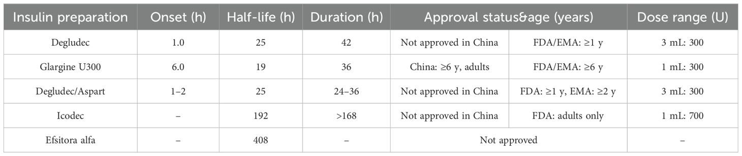 With a half-life of 25 hours, this ultra-long-acting insulin provides a stable basal insulin supply, achieving steady-state plasma concentration in 2–3 days (15). Approved in China for adults with T2DM and in the US and Europe for T1DM patients aged ≥1 year, studies show it offers similar glycemic control and hypoglycemia risk to insulin glargine U300 but at a lower daily dose (16).