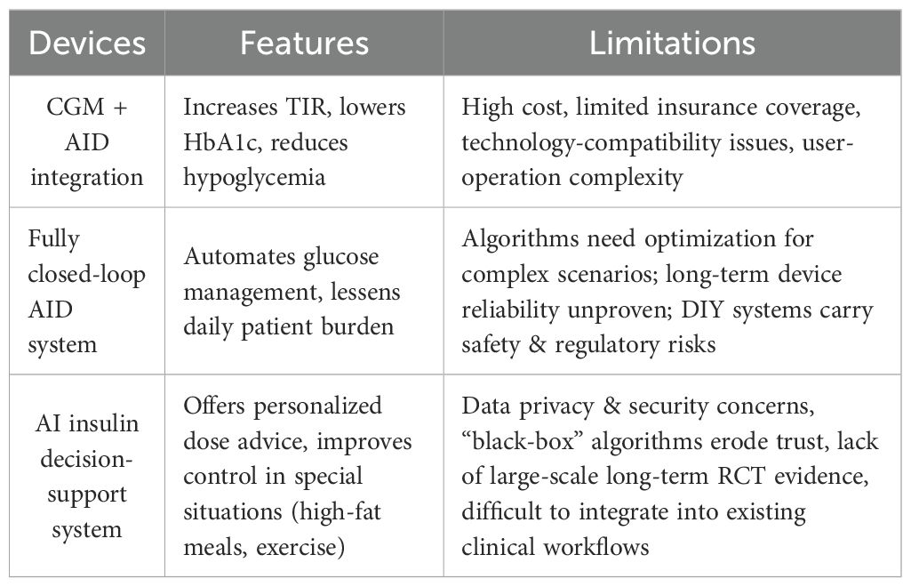 CGM, Automated Insulin Delivery (AID) systems, fully closed-loop technology, and AI-powered decision support systems represent the future direction of T1DM management, capable of significantly improving the quality of glycemic control and patient quality of life. However, their widespread adoption remains limited by numerous practical factors such as cost, technical reliability, regulatory frameworks, data security, and healthcare accessibility. Addressing these challenges in the future requires interdisciplinary collaboration, particularly focused on reducing costs and improving system interoperability, while simultaneously accumulating more real-world evidence and developing corresponding regulatory guidelines and training systems to ensure all T1DM patients can benefit equitably from these innovative technologies.