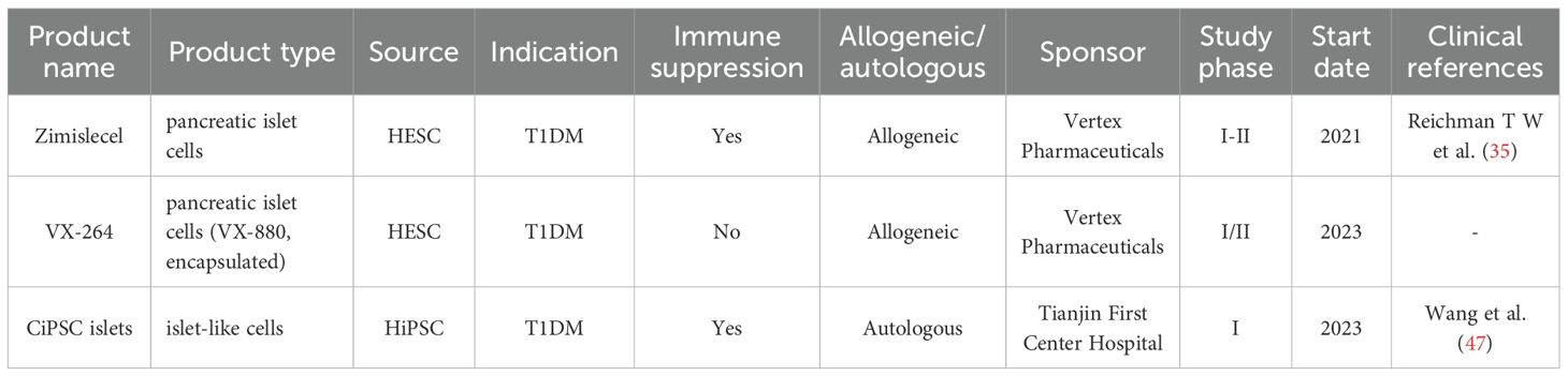 An open-label Phase 1/2 trial (NCT03163511) (35) enrolled 10 C-peptide negative T1DM patients who were implanted with devices loaded with a high dose of islet cells. At 6 months post-operation, 4 patients showed C-peptide secretion, with 3 maintaining C-peptide ≥0.1 nmol/L for one year. Insulin use significantly decreased, TIR increased from 55% to 85%, and daily insulin dose was reduced by 44%. No transplant rejection or serious adverse events were observed.