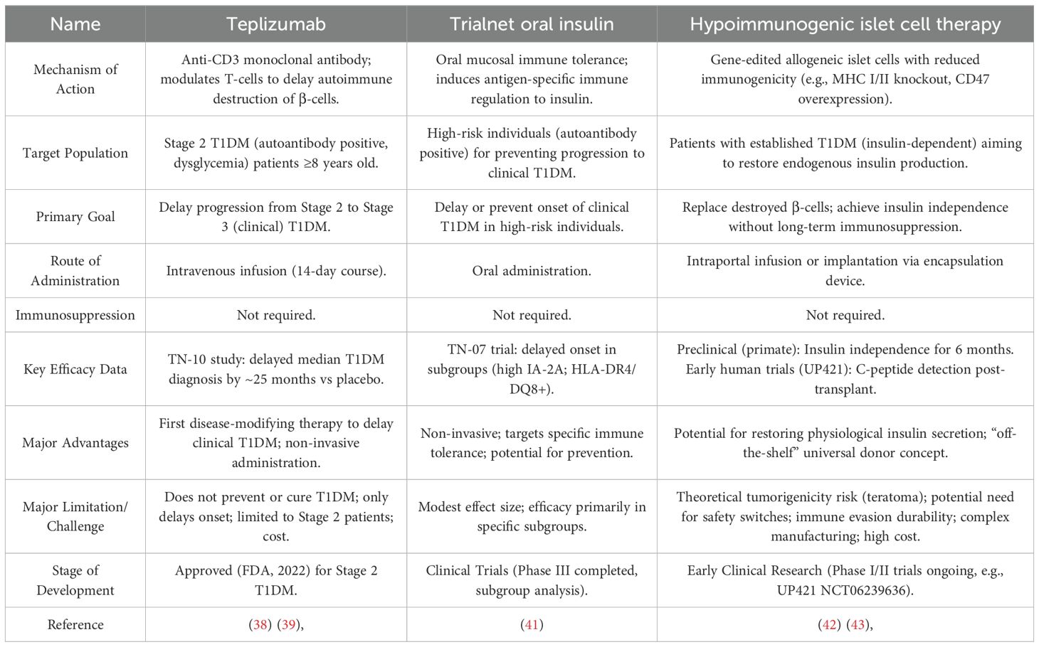 Teplizumab (Tzield) is a groundbreaking immunomodulatory drug that targets the underlying autoimmune process of T1DM. It works by binding to CD3 on the surface of T cells, which are responsible for destroying the insulin-producing pancreatic β-cells (38) (see Table 5). This action helps to modulate the immune response, preserving β-cell function and delaying the progression to clinical T1DM.