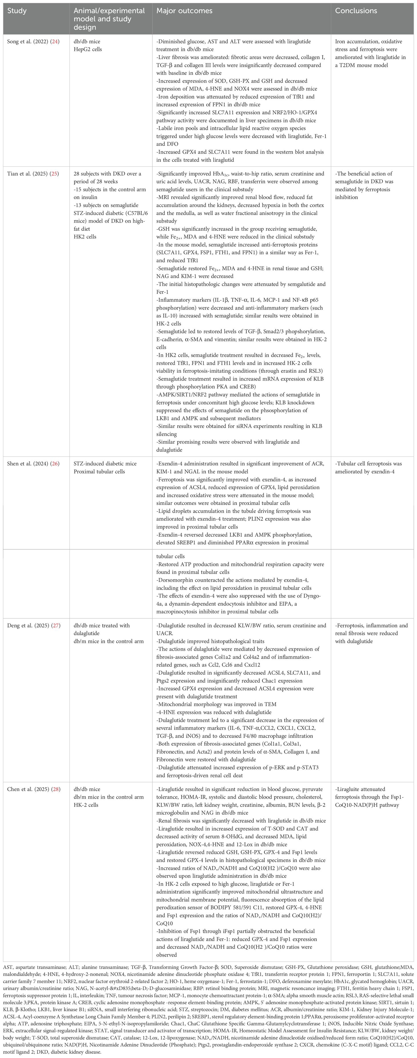 Only one study included subjects with DKD (25). All other studies focusing on ferroptosis used exclusively experimental models: HK2 cells (25, 28), HepG2 cells (24) and C57BL6 db/db mice (25, 27, 28). A variety of GLP-1RAs has been used: semaglutide (25), liraglutide (24, 25, 28), dulaglutide (25, 27) and exendin-4 (26). From a methodological perspective, randomisation was present in all studies, and all mice in the experimental arms were treated with fixed drug doses (24–28). This is a notable contrast to the only study encompassing subjects with DKD, as a dose escalation in the insulin detemir (from 0.2 U to 2.0 U) and in the semaglutide (from 0.25 mg to 0.5 mg) groups was noted (25). Mice were mostly 8 to 10 weeks old. Their number varied considerably between 18 and 40 mice across the different studies and dependent on study arms (24–28). Similar conditions were used for cell cultures (24, 25, 28). Ferroptosis was induced in cell cultures with the use of erastin (24), RSL3 (28) and suppressed with the use of Fer-1 (24, 28). Iron chelators (such as deferoxamine mesylate) (24) and other mediators (such as iFsp1) (28) were also applied.